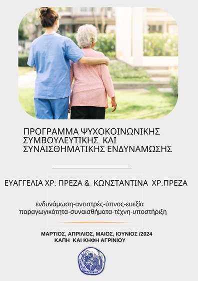 Ο Δήμος Αγρινίου υλοποιεί το "Πρόγραμμα Ψυχοκοινωνικής Συμβουλευτικής και Συναισθηματικής Ενδυνάμωσης της τρίτης ηλικίας" με μια σειρά εκδηλώσεων στο ΚΑΠΗ Αγρινίου και στο ΚΗΦΗ Αγίου Κωνσταντίνου.