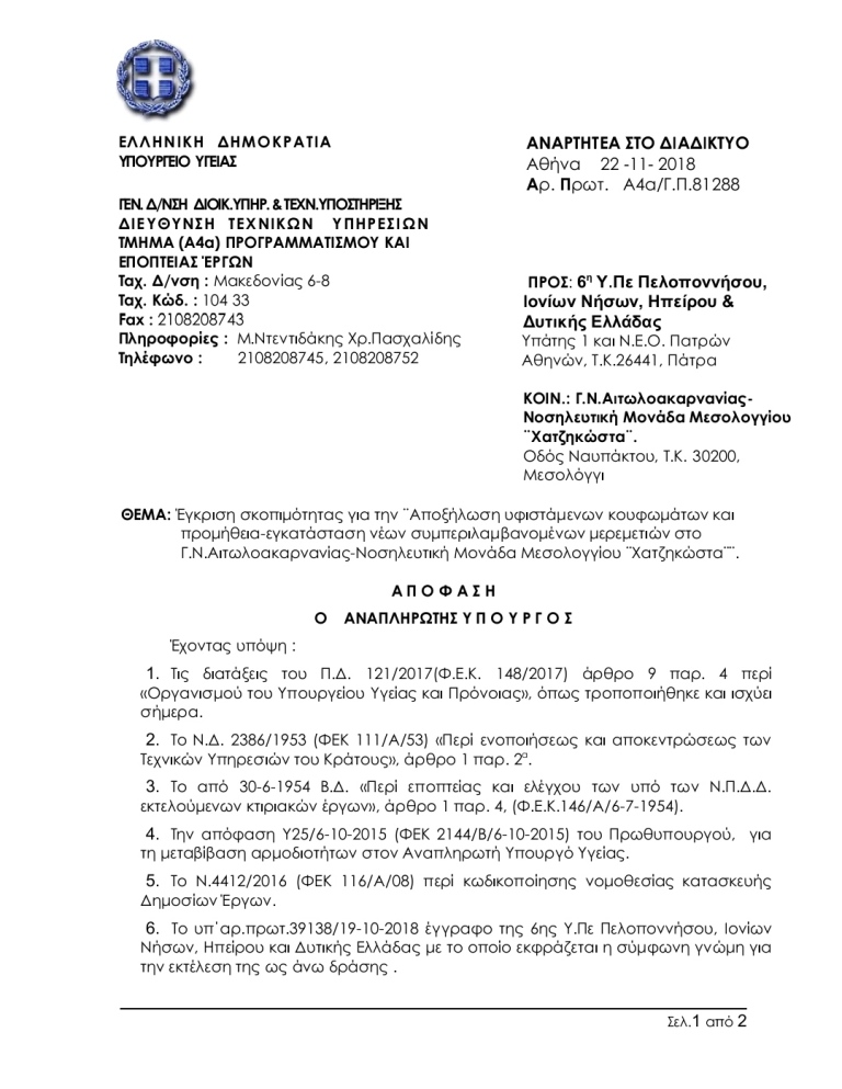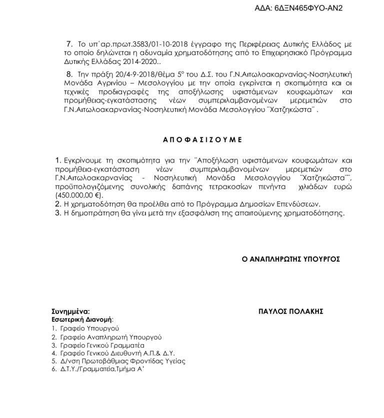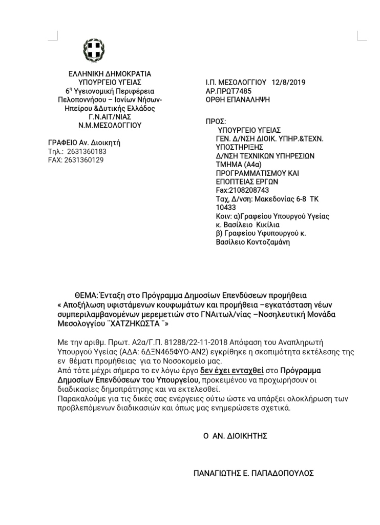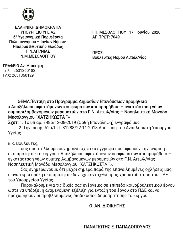Ο Αν. Διοικητής του Γ.Ν. Αιτωλ/νίας Π. Παπαδόπουλος ακολούθησε μια διαδικασία επιστολών τα οποία κοινοποιήθηκαν σε όλους τους βουλευτές του νομού Αιτωλοακαρνανίας προκειμένου να κατατεθεί σχετική ερώτηση στη Βουλή των Ελλήνων, για την ένταξη στο Πρόγραμμα Δημοσίων Επενδύσεων του έργου ¨Αποξήλωση υφιστάμενων κουφωμάτων και προμήθεια-εγκατάσταση νέων συμπεριλαμβανομένων μερεμετιών στο Γ.Ν.Αιτωλοακαρνανίας-Νοσηλευτική Μονάδα Μεσολογγίου ¨Χατζηκώστα¨.