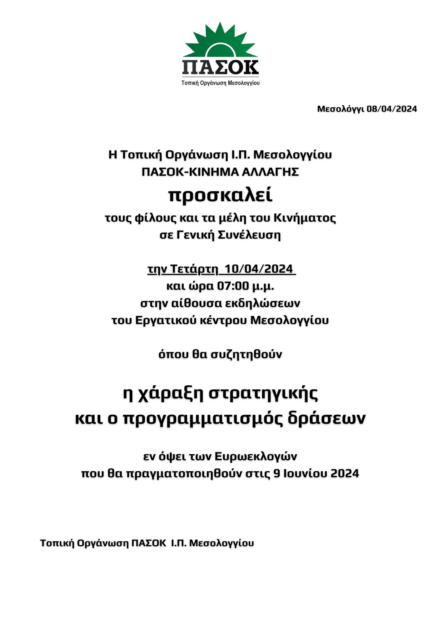 Η Τοπική Οργάνωση Ι.Π. Μεσολογγίου ΠΑΣΟΚ-ΚΙΝΗΜΑ ΑΛΛΑΓΗΣ ,