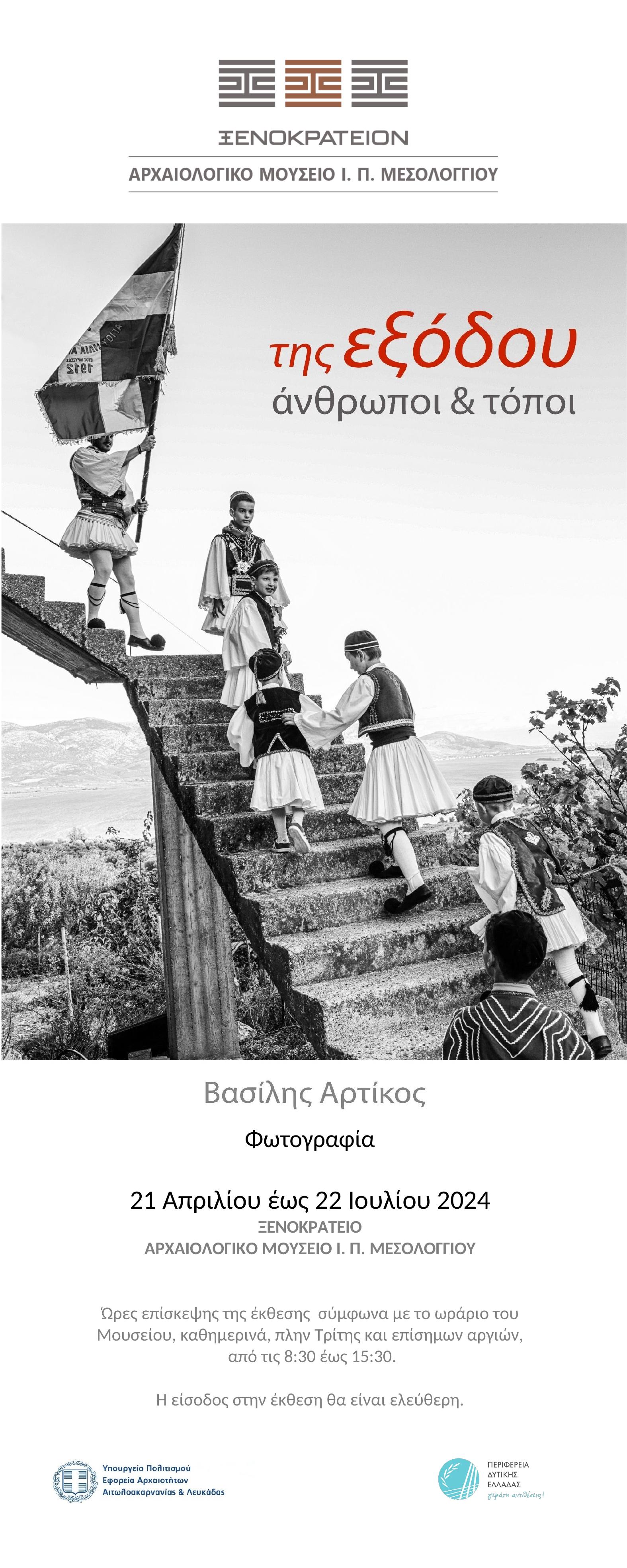 Η Εφορεία Αρχαιοτήτων Αιτωλοακαρνανίας και Λευκάδας, σε συνεργασία με την Περιφέρεια Δυτικής Ελλάδας, διοργανώνει την περιοδική έκθεση φωτογραφίας του Βασίλη Αρτίκου με θέμα «Της Εξόδου… Άνθρωποι και Τόποι», η οποία θα παρουσιαστεί στο Ξενοκράτειο Αρχαιολογικό Μουσείο στο Μεσολόγγι.