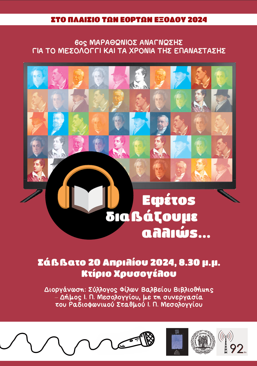 Στον 6ο Μαραθώνιο Ανάγνωσης για το Μεσολόγγι και τα χρόνια της Επανάστασης, διαβάζουμε αλλιώς. Σκοπός, η δημιουργία μιας βιβλιοθήκης ηχητικών αναγνωσμάτων για το Μεσολόγγι, με αφετηρία τις εφετινές Εορτές Εξόδου 2024 και τερματισμό την επέτειο των διακοσίων χρόνων από την ηρωική Έξοδο το 2026: «200 Βιβλία για 200 Χρόνια».