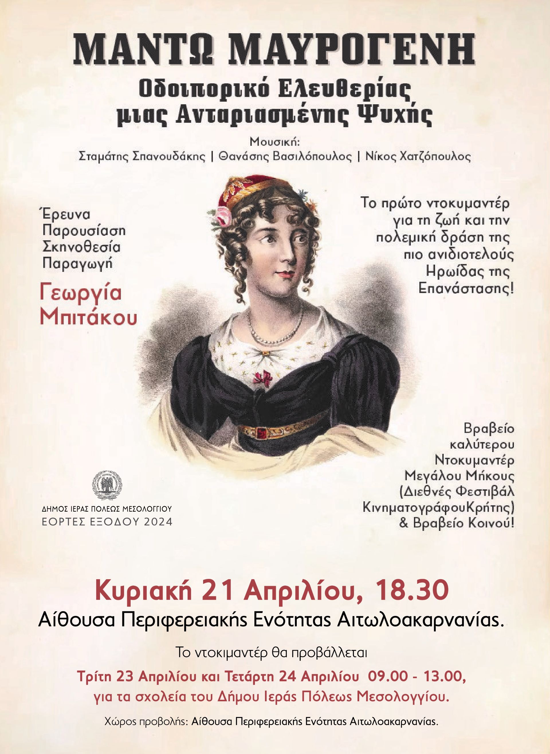 Ο Δήμος Ιερής Πόλης Μεσολογγίου σας προσκαλεί στην προβολή του πρώτου ντοκιμαντέρ για τη ζωή και την πολεμική δράση της Μαντώ Μαυρογένη, της πιο ανιδιοτελούς ηρωίδας της Ελληνικής Επανάστασης, την Κυριακή, 21 Απριλίου 2024 στις 18:30 στην αίθουσα εκδηλώσεων της Περιφερειακής Ενότητας Αιτωλοακαρνανίας.