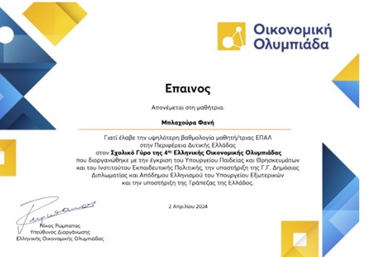 Έπαινο απέσπασε η μαθήτρια του σχολείου μας, Φανή Μπλαχούρα , η οποία συμμετείχε στο Σχολικό Γύρο της 4ης Διεθνούς Οικονομικής Ολυμπιάδας,  προκρίθηκε στην επόμενη φάση και έλαβε την υψηλότερη βαθμολόγια μαθητή/τριας ΕΠΑΛ στην Περιφέρεια Δυτικής Ελλάδας, υπό την καθοδήγηση των Οικονομολόγων, κ. Γκανιάτσα Αλέξη και κ. Μήτσου Ελένης.