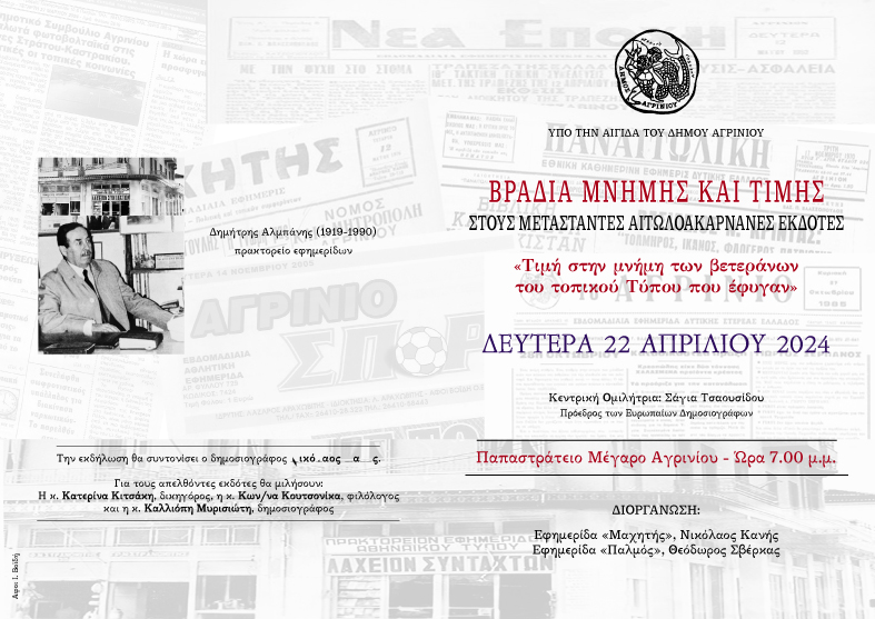 Τη Δευτέρα 22 Απριλίου 2024 και ώρα 7 μ.μ. στο Παπαστράτειο Μέγαρο Αγρινίου θα πραγματοποιηθεί εκδήλωση με τίτλο: «Τιμή στη μνήμη των Βετεράνων του Τοπικού Τύπου που έφυγαν», υπό την αιγίδα του Δήμου Αγρινίου.