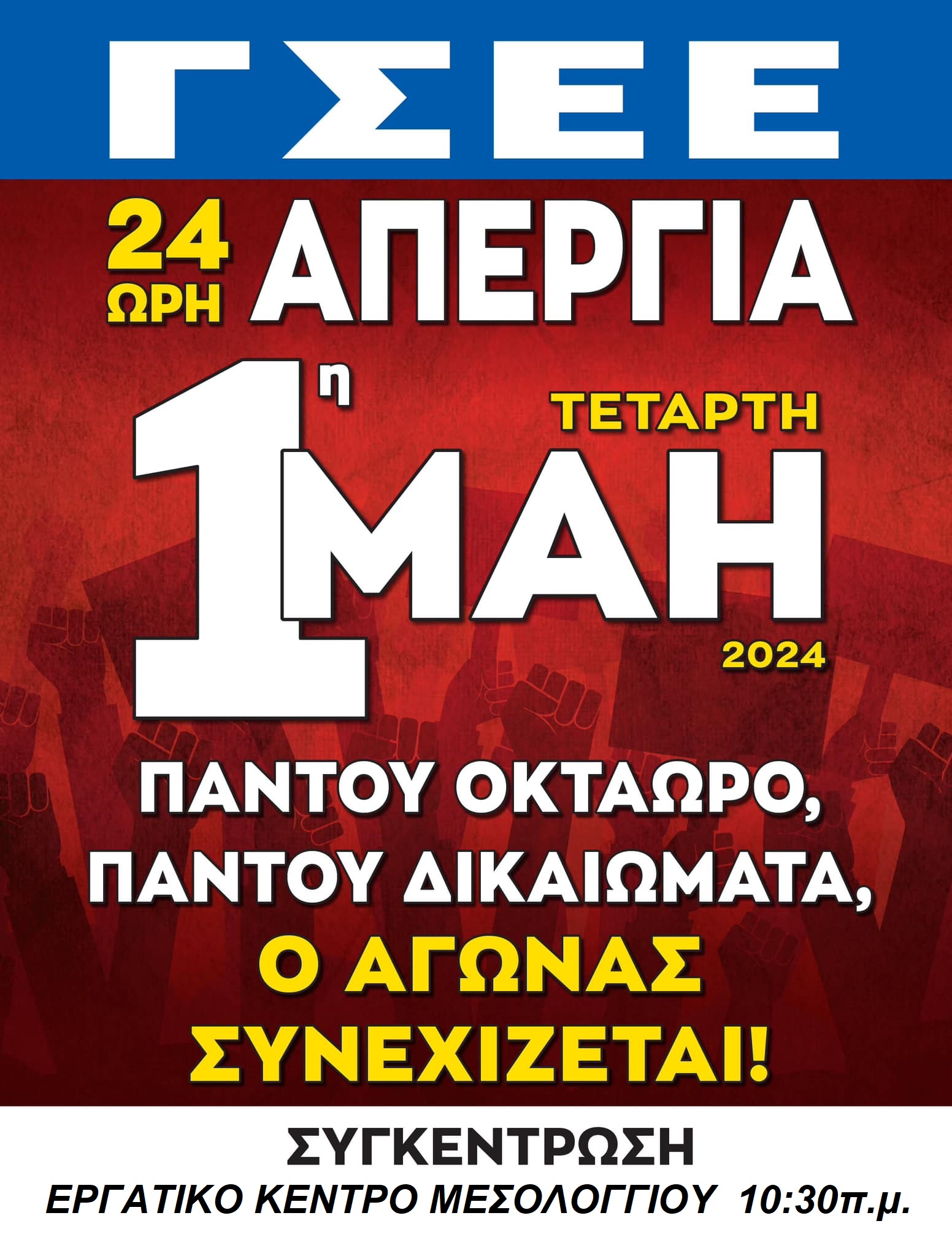 Η Διοίκηση του Εργατοϋπαλληλικού Κέντρου Ι.Π. Μεσολογγίου καλεί όλες τις εργαζόμενες και όλους τους εργαζόμενους, ανέργους, συνταξιούχους στην απεργιακή συγκέντρωση της Εργατικής Πρωτομαγιάς την Τετάρτη 1 Μαΐου 2024 και ώρα 10:30 στο χώρο του Εργατικού Κέντρου Μεσολογγίου και στην κατάθεση στεφάνου που θα ακολουθήσει.