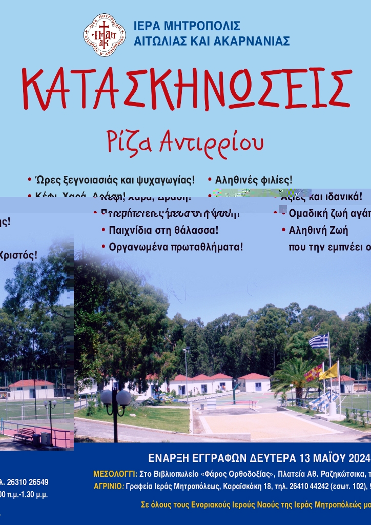 Από την Δευτέρα 13 Μαΐου 2024 ξεκινούν οι εγγραφές στις Κατασκηνώσεις της Ιεράς Μητροπόλεως Αιτωλίας και Ακαρνανίας. Οι εγγραφές θα πραγματοποιούνται καθημερινά: