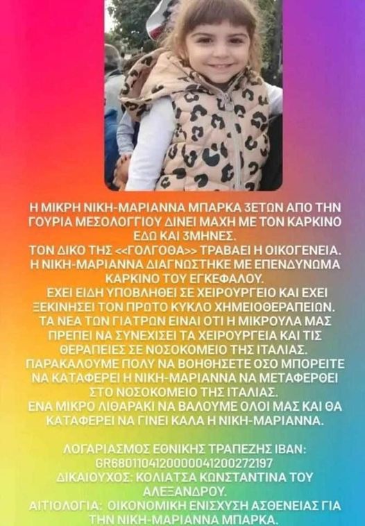 Η Νίκη-Μαριάννα Μπάρκα, ένα τρίχρονο κοριτσάκι από τη Γουριά Μεσολογγίου, δίνει μάχη με τον καρκίνο εδώ και τρεις μήνες. Για να βγει νικήτρια στον αγώνα αυτό, έχει ανάγκη την βοήθεια όλων μας.