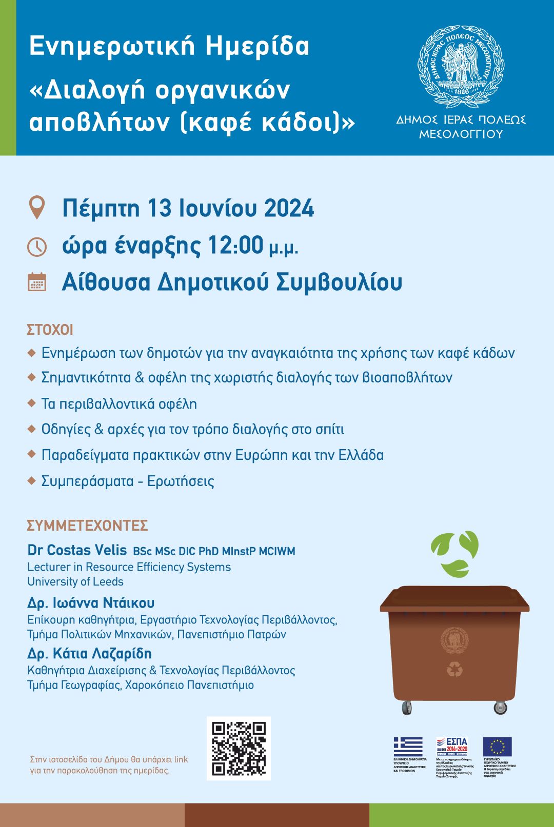 Ο Δήμος Ιερής Πόλης Μεσολογγίου υπενθυμίζει ότι η ενημερωτική ημερίδα «Διαλογή οργανικών αποβλήτων (καφέ κάδοι)» θα πραγματοποιηθεί την Πέμπτη, 13 Ιουνίου 2024 στις 12:00, στην αίθουσα του Δημοτικού Συμβουλίου. Επιπλέον, θα παρέχεται η δυνατότητα παρακολούθησής της μέσω της ιστοσελίδας του Δήμου http://messolonghi.gov.gr/