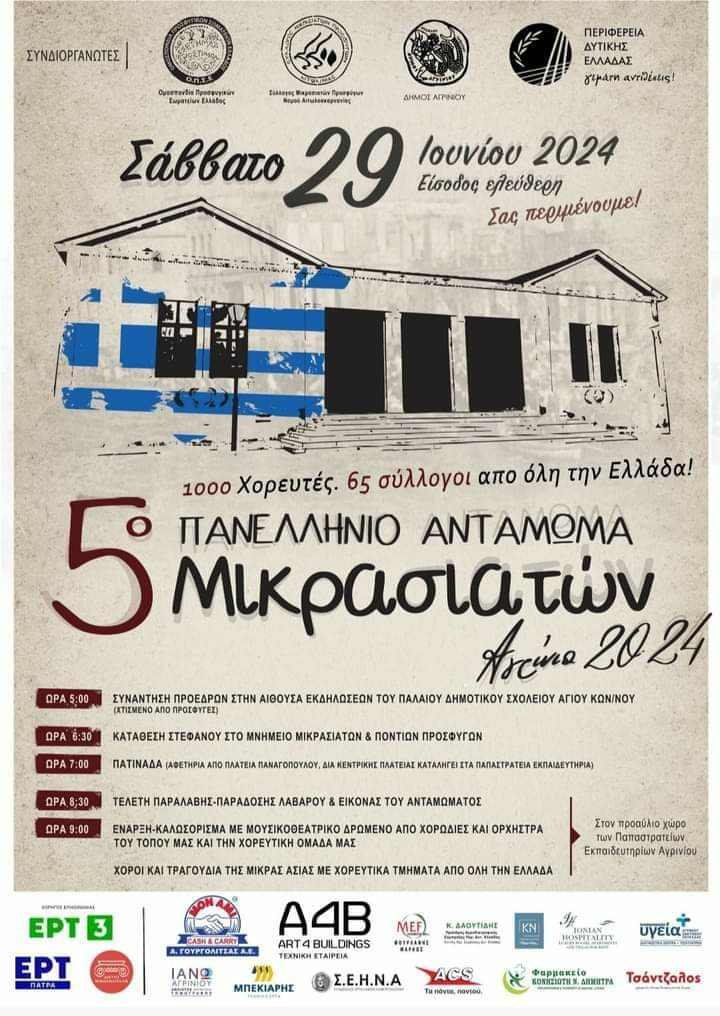 Ο Σύλλογος Μικρασιατών Προσφύγων Αιτωλοακαρνανίας, ο  Δήμος Αγρινίου,  η Περιφέρεια Δυτικής Ελλάδας σας προσκαλούν σε μια  ξεχωριστή συνάντηση μνήμης και πολιτισμού.