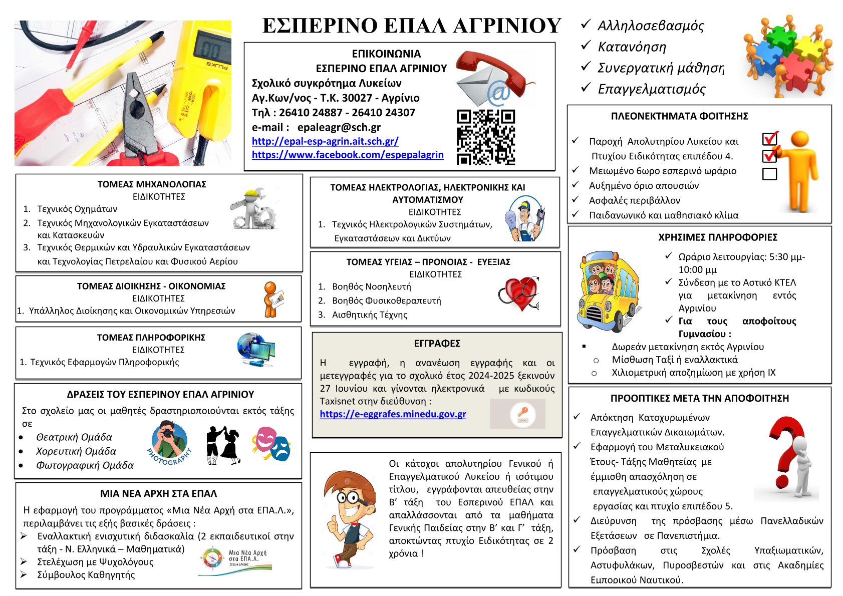 Το Εσπερινό ΕΠΑΛ Αγρινίου θα παραμείνει ανοικτό για την εξυπηρέτηση  όσων επιθυμούν να κάνουν την εγγραφή στο σχολείο ή για την κατάθεση  των δικαιολογητικών κάθε ημέρα (18:00-21:00) από την Πέμπτη 27/6 έως  και την Παρασκευή 05/07. Παράλληλα το σχολείο θα είναι ανοικτό την  Πέμπτη 04/07 και πρωινές ώρες (08:30-13:00) για την εξυπηρέτηση του  κοινού.