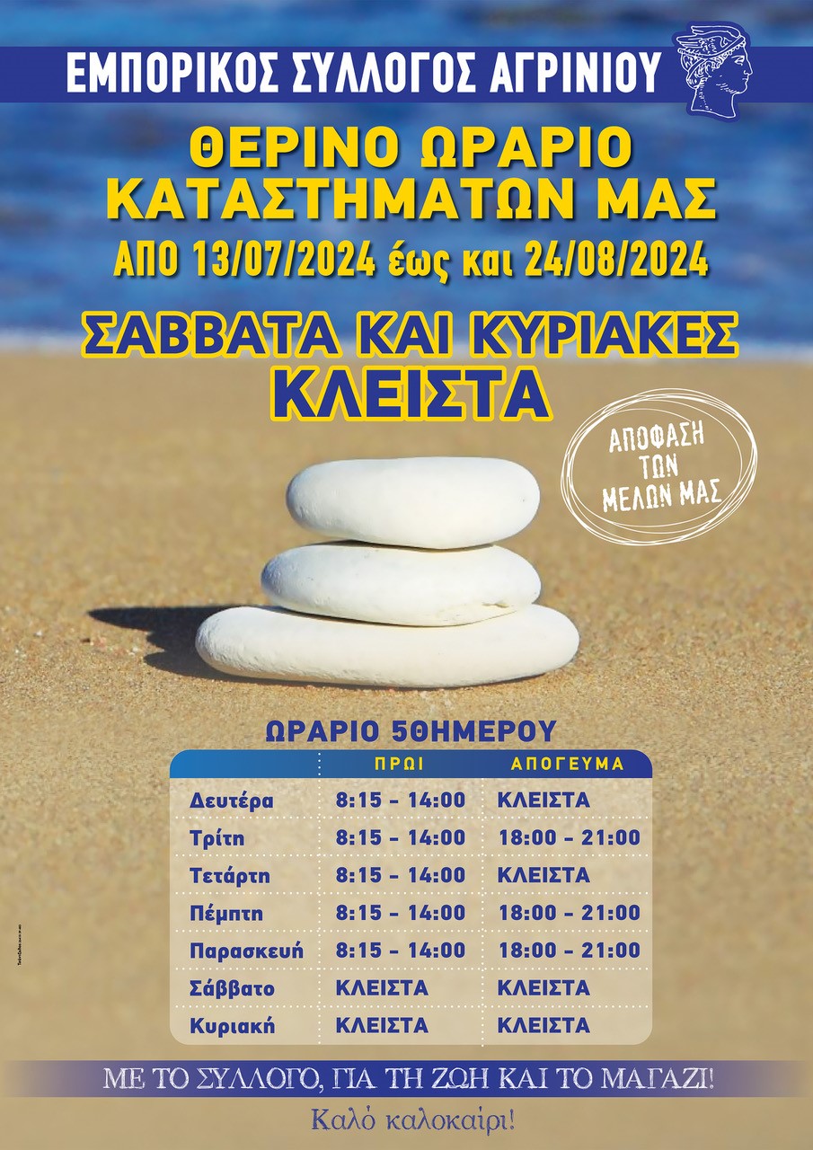Εμπορικός Σύλλογος Αγρινίου: Θερινό ωράριο καταστημάτων