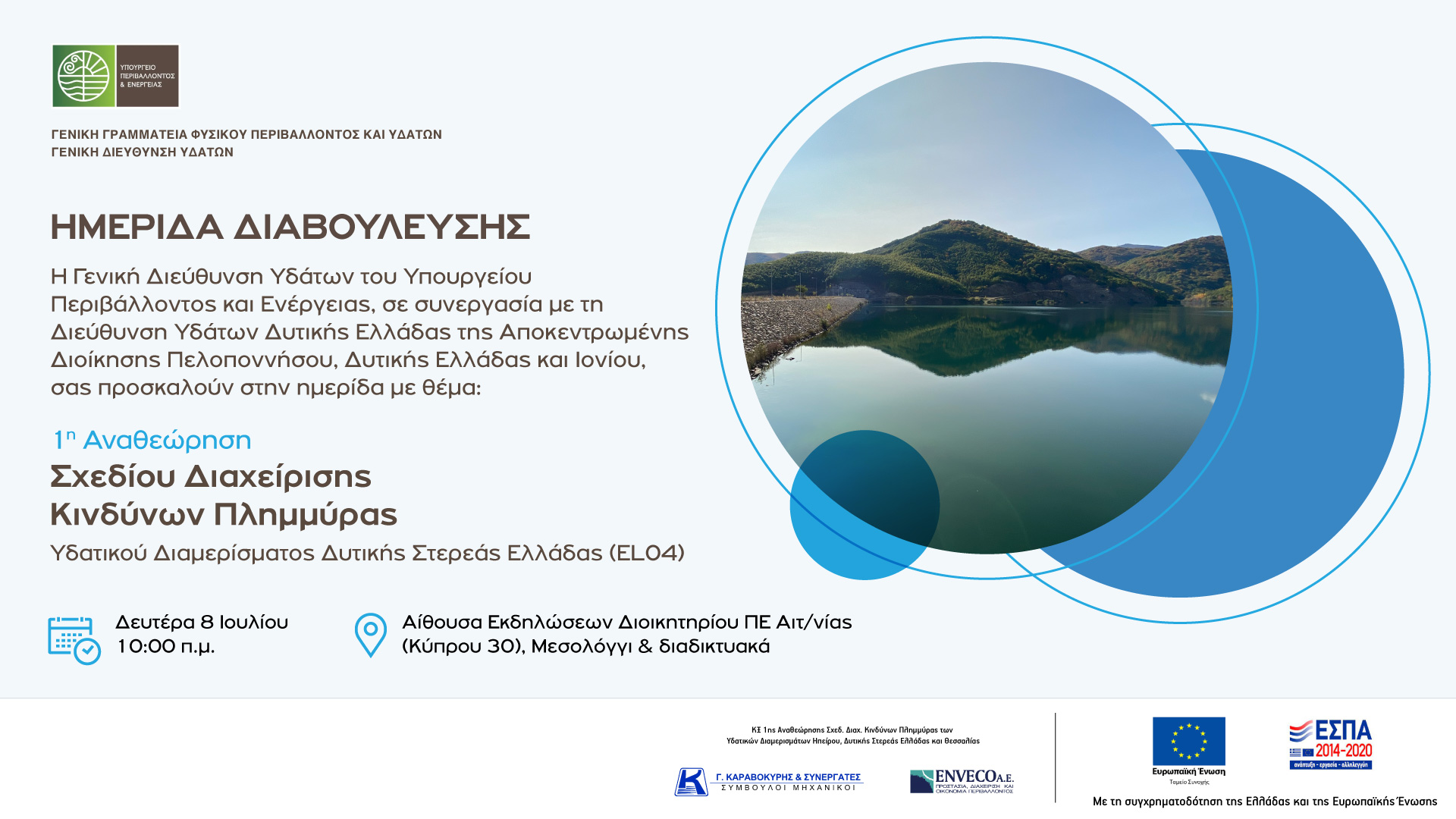 Η Γενική Διεύθυνση Υδάτων του Υπουργείου Περιβάλλοντος και Ενέργειας σε συνεργασία με τη Διεύθυνση Υδάτων Δυτικής Ελλάδας της Αποκεντρωμένης Διοίκησης Πελοποννήσου, Δυτικής Ελλάδας και Ιονίου, διοργανώνει ημερίδα διαβούλευσης της 1ης Αναθεώρησης του Σχεδίου Διαχείρισης Κινδύνων Πλημμύρας (ΣΔΚΠ) του Υδατικού Διαμερίσματος Δυτικής Στερεάς Ελλάδας (EL04). H ημερίδα πραγματοποιείται τη Δευτέρα, 8 Ιουλίου 2024 και ώρα 10:00 π.μ., στην Αίθουσα Εκδηλώσεων Διοικητηρίου ΠΕ Αιτωλοακαρνανίας (Κύπρου 30, Μεσολόγγι), με δυνατότητα συμμετοχής και διαδικτυακά και έχει ως στόχο την πληρέστερη ενημέρωση των ενδιαφερομένων μερών και του ευρύτερου κοινού επί του Προσχεδίου, καθώς και την καταγραφή σχετικών απόψεων και σχολίων.