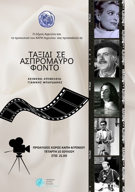 Η Διεύθυνση Προσχολικής Αγωγής, Προγραμμάτων, Παιδιού, ΑμεΑ και Τρίτης Ηλικίας, ο Δήμος Αγρινίου, το προσωπικό του ΚΑΠΗ Αγρινίου και η Περιφέρεια Δυτικής Ελλάδας σας προσκαλούν την Τετάρτη 10 Ιουλίου στις 21.00 σε μια νοσταλγική βραδιά κάτω από τα αστέρια, με θέμα τον παλιό Ελληνικό κινηματογράφο.