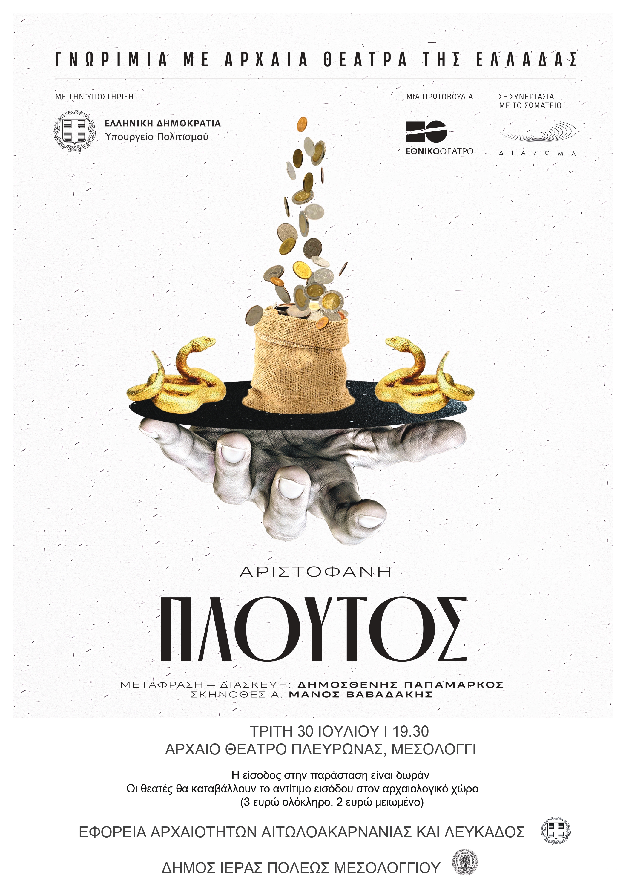 Για την αποψινή παράσταση «Πλούτος» του Εθνικού Θεάτρου στον αρχαίο θέατρο Πλευρώνας, διευκρινίζεται ότι η είσοδος σε αυτό θα επιτραπεί αυστηρά σε 400 άτομα τα οποία θα διαθέτουν δελτίο εισόδου. Τα δελτία εισόδου θα διανέμονται κατά σειρά προσέλευσης μια ώρα πριν την έναρξη της παράστασης και για το λόγο αυτό παρακαλείσθε για την έγκαιρη προσέλευσή σας.