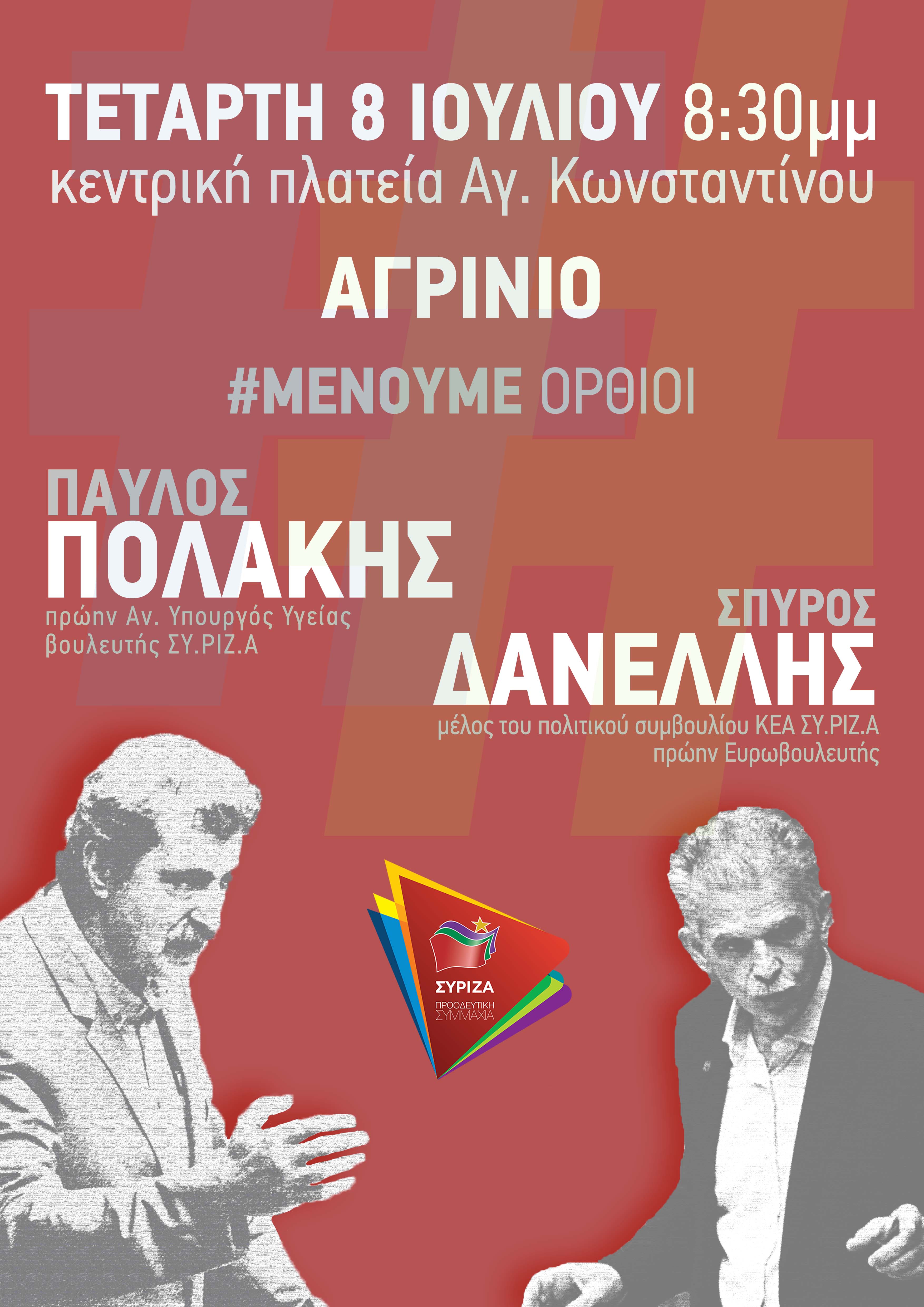 Εκδήλωση Σύριζα Αιτωλοακαρνανίας στο Αγρίνιο Τετάρτη 8 Ιουλίου