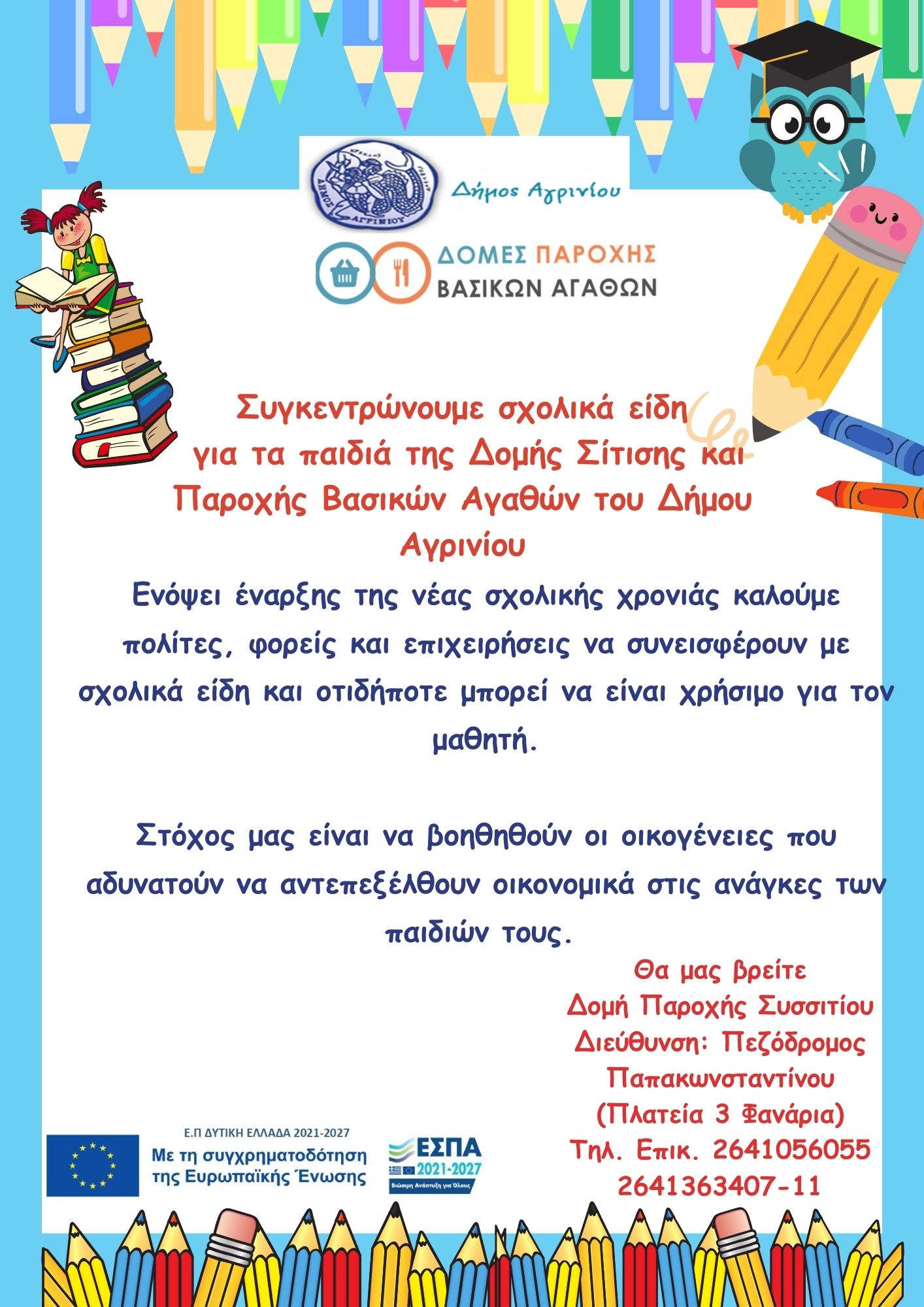 Η «Δομή Σίτισης και Παροχής Βασικών Αγαθών» της Διεύθυνσης Κοινωνικής Προστασίας & Δημόσιας Υγείας Δήμου Αγρινίου, ενόψει της νέας σχολικής χρονιάς, καλεί πολίτες, φορείς και επιχειρήσεις να συνεισφέρουν στις οικογένειες της Δομής προσφέροντας σχολικά είδη και πολλά χαμόγελα.