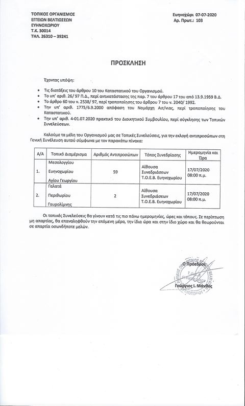 «Παρακαλούνται τα μέλη - καλλιεργητές του ΤΟΕΒ Ευηνοχωρίου όπως προσέλθουν στην Τοπική Συνέλευση του Οργανισμού για την εκλογή των νέων αντιπροσώπων του ΤΟΕΒ Ευηνοχωρίου τετραετίας 2020-2024».