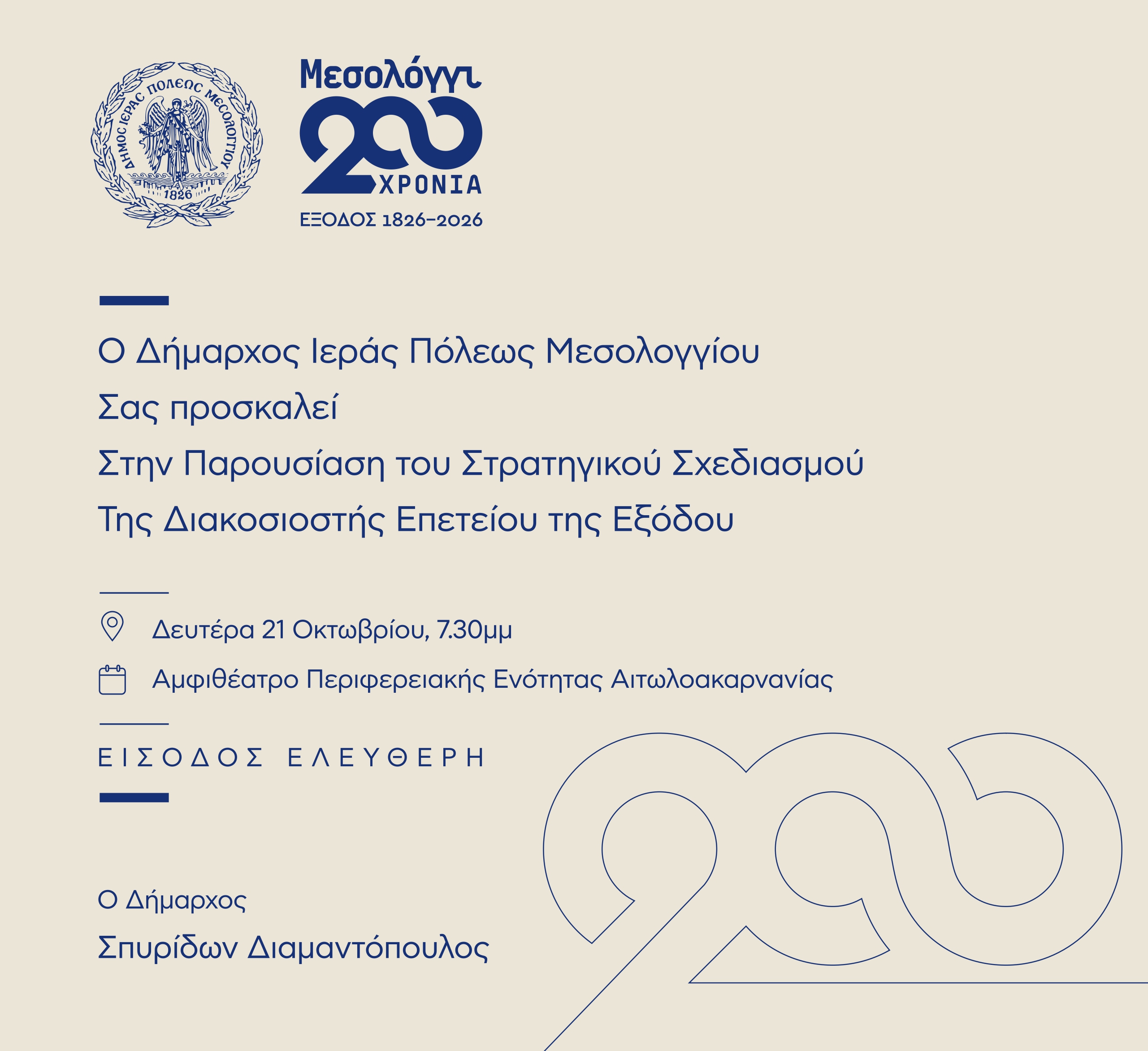 Ο Δήμαρχος Ιεράς Πόλεως Μεσολογγίου Σπυρίδων Β. Διαμαντόπουλος σας προσκαλεί στην Παρουσίαση του Στρατηγικού Σχεδιασμού της Διακοσιοστής Επετείου της Εξόδου των Ελεύθερων Πολιορκημένων, τη Δευτέρα, 21 Οκτωβρίου 2024, στις 19:30 στο Αμφιθέατρο της Περιφερειακής Ενότητας Αιτωλοακαρνανίας (Κύπρου 30, ΤΚ 302 00, Μεσολόγγι).