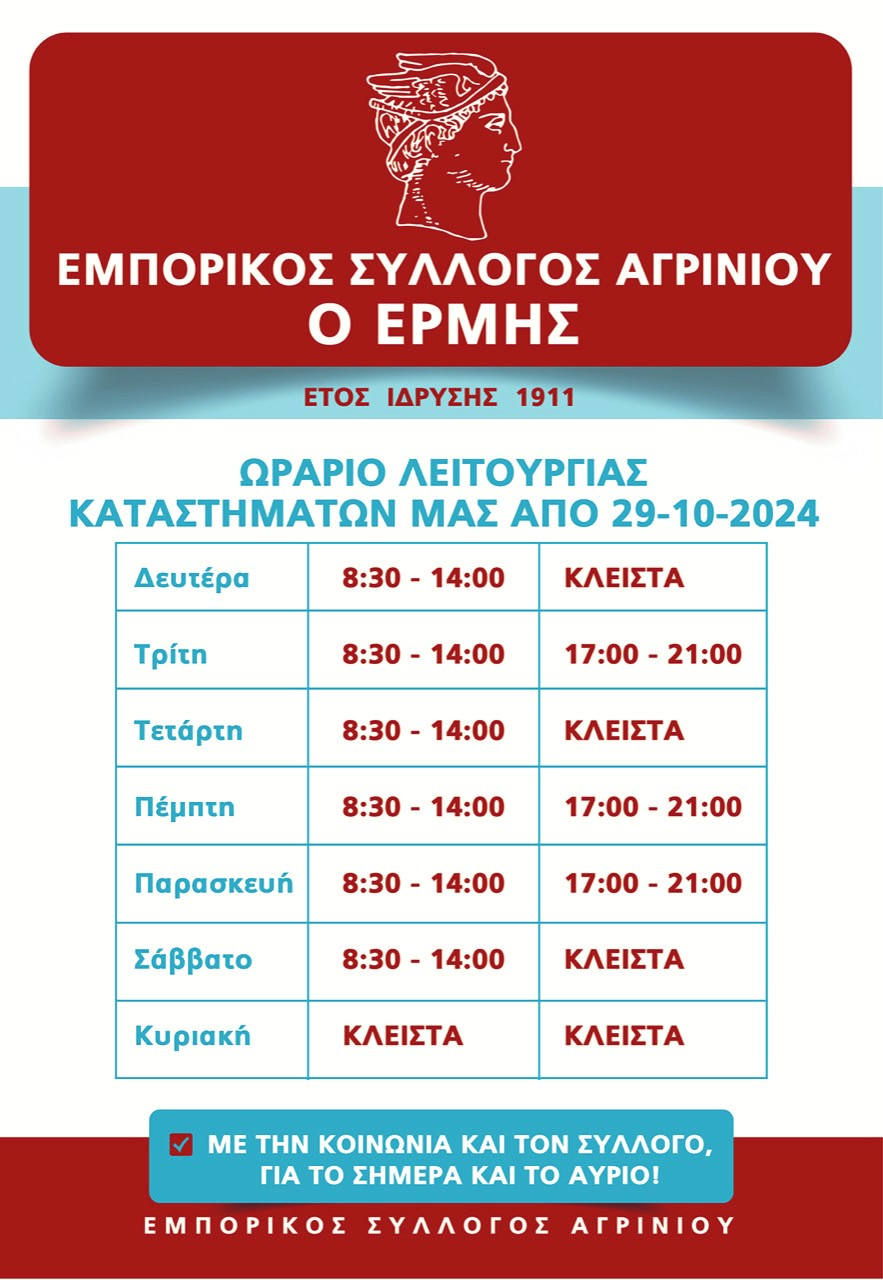 Εμπορικός Σύλλογος Αγρινίου: Xειμερινό ωράριο καταστημάτων