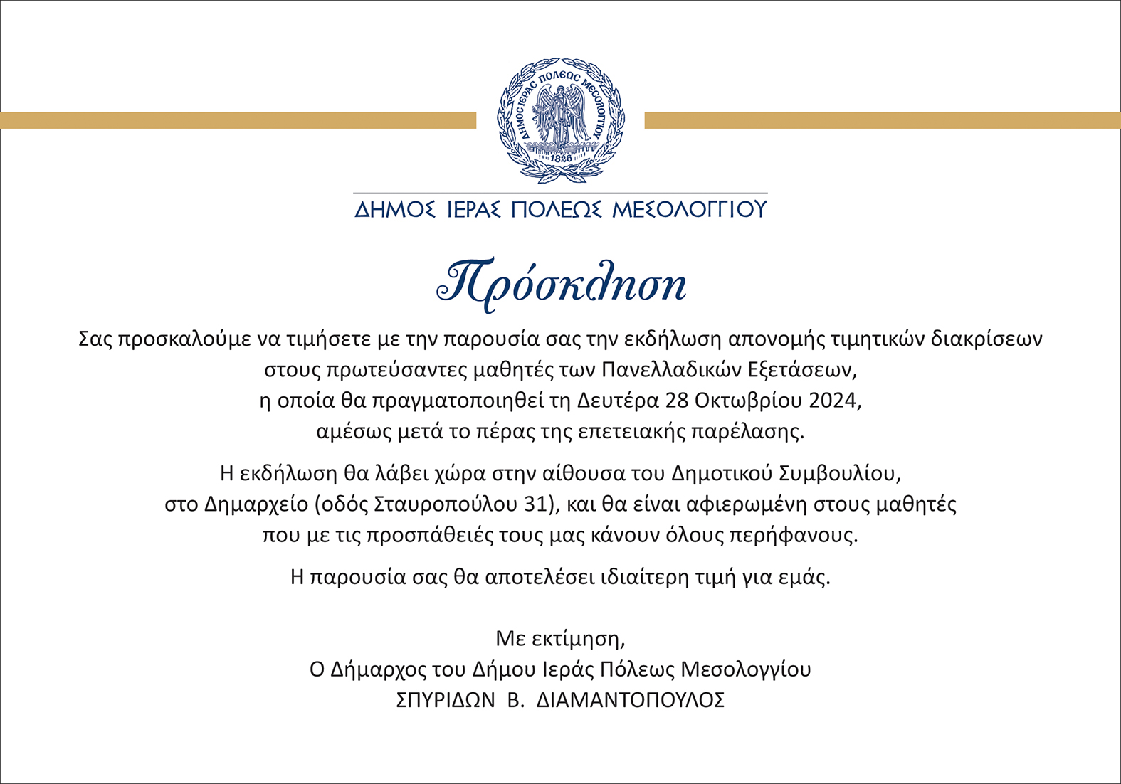 Πρόσκληση σε απονομή τιμητικών διακρίσεων στους Πρωτεύσαντες των Πανελλαδικών Εξετάσεων από τον Δήμο Ιερής Πόλης Μεσολογγίου