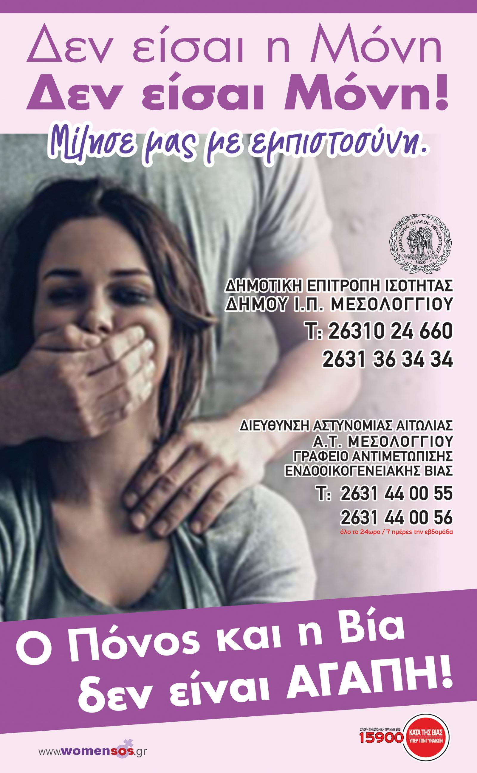 Τηλεφώνησε και μίλησε Εμπιστευτικά στις Κοινωνικές Υπηρεσίες του Δήμου Ιερής Πόλης Μεσολογγίου (26310 24660, 26313 63434) ή στο Γραφείο Αντιμετώπισης Ενδοοικογενειακής Βίας του Αστυνομικού Τμήματος Μεσολογγίου (26314 40055, 26314 40056, όλο το 24ωρο/7 ημέρες την εβδομάδα) όπως και στην Πανελλαδική Γραμμή 15900.