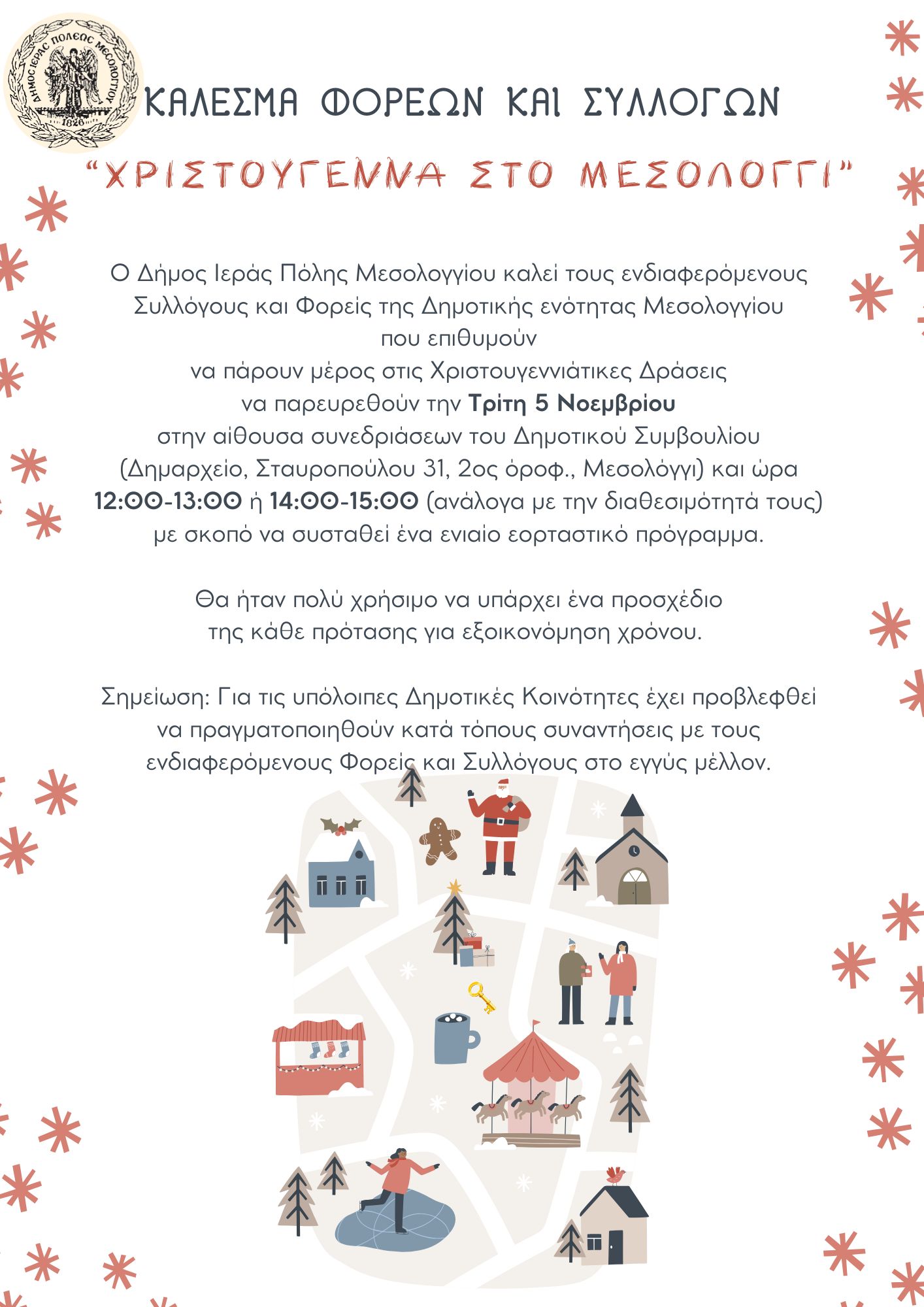 Ο Δήμος Ιερής Πόλης Μεσολογγίου καλεί τους ενδιαφερόμενους Συλλόγους και Φορείς της Δημοτικής Ενότητας Μεσολογγίου που επιθυμούν να πάρουν μέρος στις Χριστουγεννιάτικες Δράσεις να παρευρεθούν την Τρίτη 5 Νοεμβρίου 2024 στην αίθουσα συνεδριάσεων του Δημοτικού Συμβουλίου (Δημαρχείο, Σταυροπούλου 31, 2ος όροφ., Μεσολόγγι) και ώρα 12:00-13:00 ή 14:00-15:00 (ανάλογα με την διαθεσιμότητά τους) με σκοπό να συσταθεί ένα ενιαίο εορταστικό πρόγραμμα.