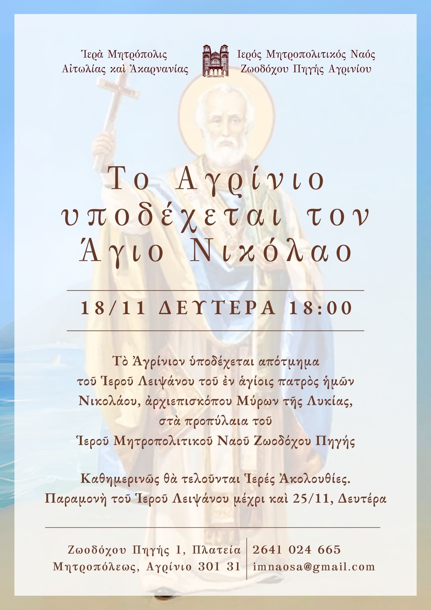Την Δευτέρα 18 Νοεμβρίου 2024 και ώρα 18:00’ στον Ιερό Μητροπολιτικό Ναό Ζωοδόχου Πηγής Αγρινίου θα πραγματοποιηθεί η υποδοχή του Ιερού Λειψάνου του Αγίου Νικολάου, Αρχιεπισκόπου Μύρων της Λυκίας του Θαυματουργού, προερχόμενο από τον Ιερό Μητροπολιτικό Ναό Αγίου Νικολάου Βόλου.
