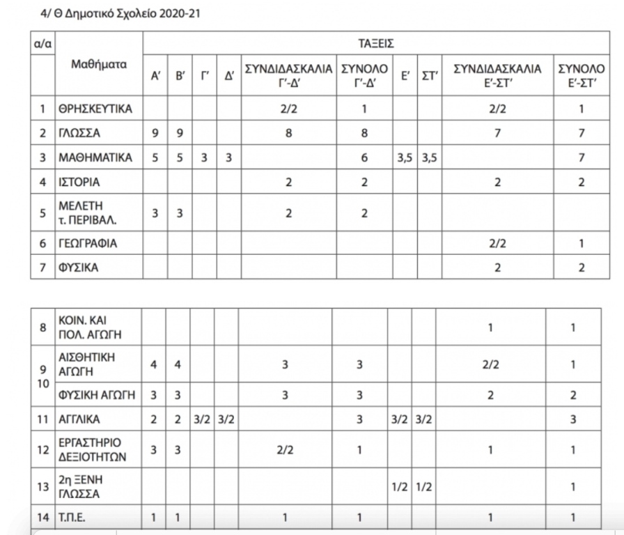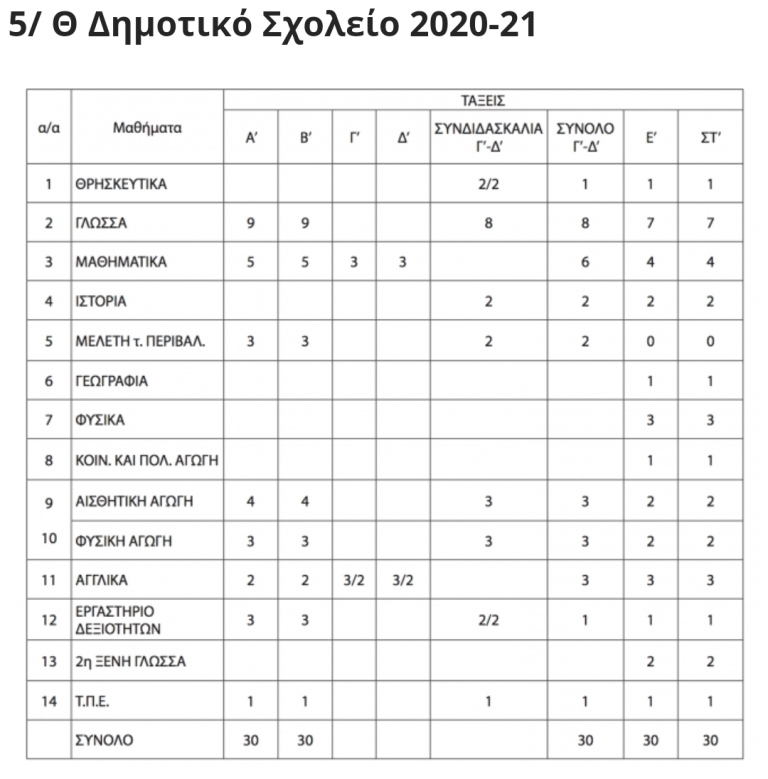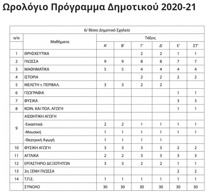 Ωρολόγιο Πρόγραμμα Δημοτικού 2020-21