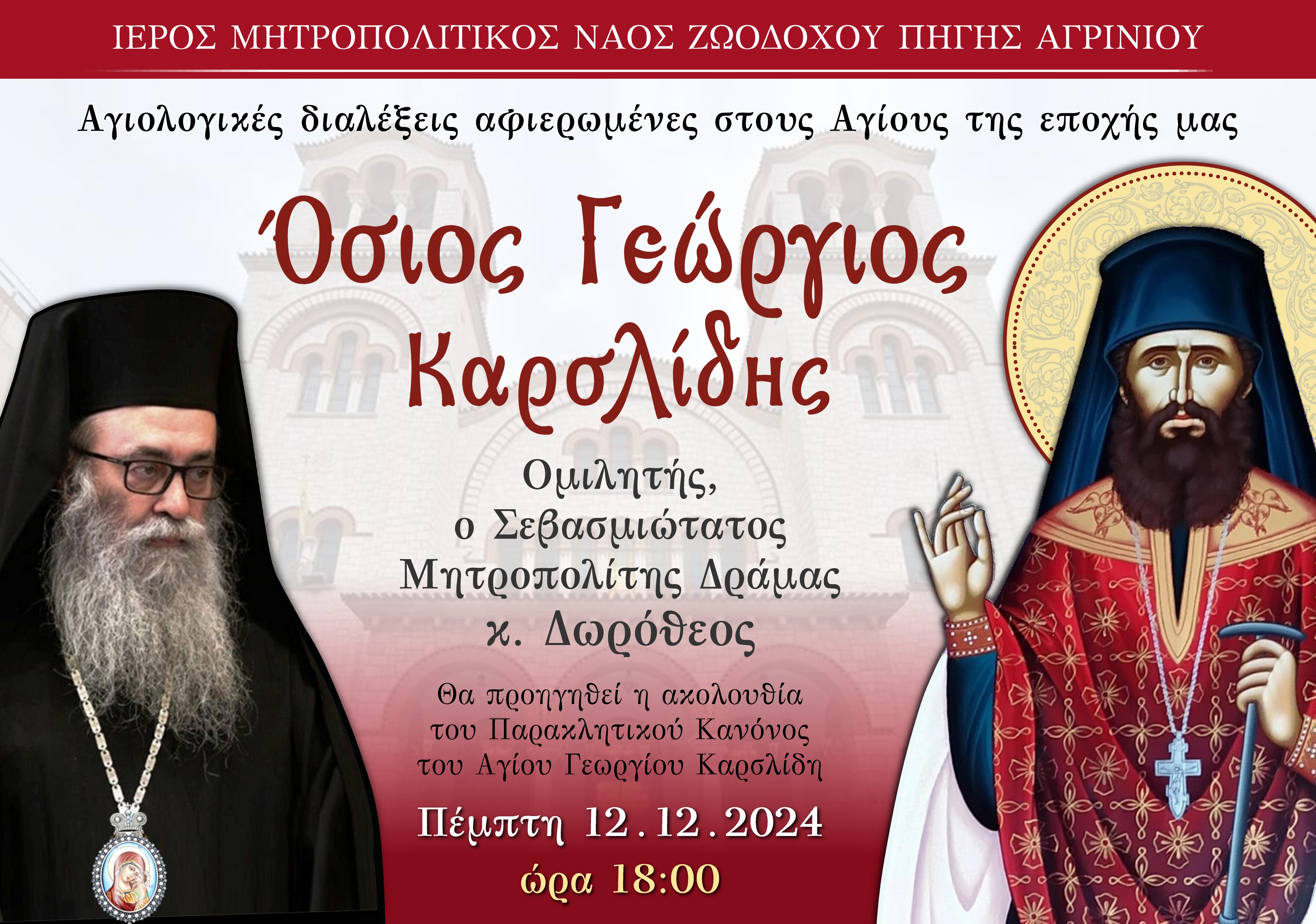 Την ερχόμενη Πέμπτη 12 Δεκεμβρίου 2024 και ώρα 6:00 το απόγευμα, στον Ιερό Μητροπολιτικό Ναό Ζωοδόχου Πηγής Αγρινίου θα πραγματοποιηθεί η τρίτη αγιολογική σύναξη, η οποία θα είναι αφιερωμένη στον Όσιο Γεώργιο τον Καρσλίδη, τον Ομολογητή εκ Δράμας.