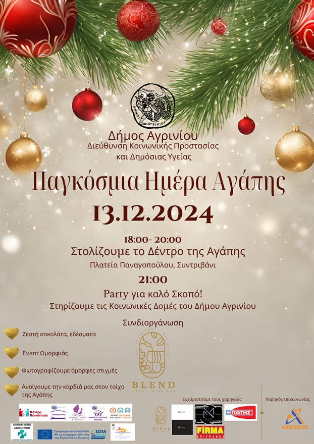 Με αφορμή την Παγκόσμια Ημέρα Αγάπης, η Διεύθυνση Κοινωνικής Προστασίας και Δημόσιας Υγείας και οι Κοινωνικές  Δομές του Δήμου Αγρινίου, στολίζουν το δέντρο της Αγάπης στην πλατεία Παναγοπούλου (Σιντριβάνι), την Παρασκευή 13 Δεκεμβρίου 2024, από τις 18:00-20:00