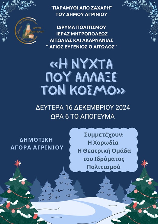 Συγκεκριμένα, την Δευτέρα 16  Δεκεμβρίου  2024  και ώρα 6 το απόγευμα, στην αίθουσα της παλαιάς Δημοτικής Αγοράς, η χορωδία και η θεατρική ομάδα  του Ιδρύματος Πολιτισμού θα παρουσιάσουν την χριστουγεννιάτικη παράσταση: «Η Νύχτα που άλλαξε τον κόσμο».