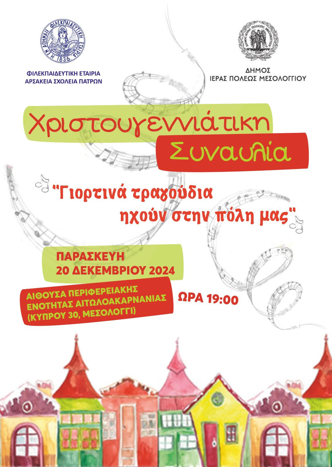 Αυτή την Παρασκευή, 20 Δεκεμβρίου 2024, «Γιορτινά τραγούδια… ηχούν στην πόλη μας» στην χριστουγεννιάτικη μουσική εκδήλωση που συνδιοργανώνουν τα Αρσάκεια Σχολεία Πατρών με τον Δήμο Ιερής Πόλης Μεσολογγίου, στις 19:00 στην Αίθουσα Εκδηλώσεων της Περιφερειακής Ενότητας Αιτωλοακαρνανίας (Κύπρου 30, Μεσολόγγι).