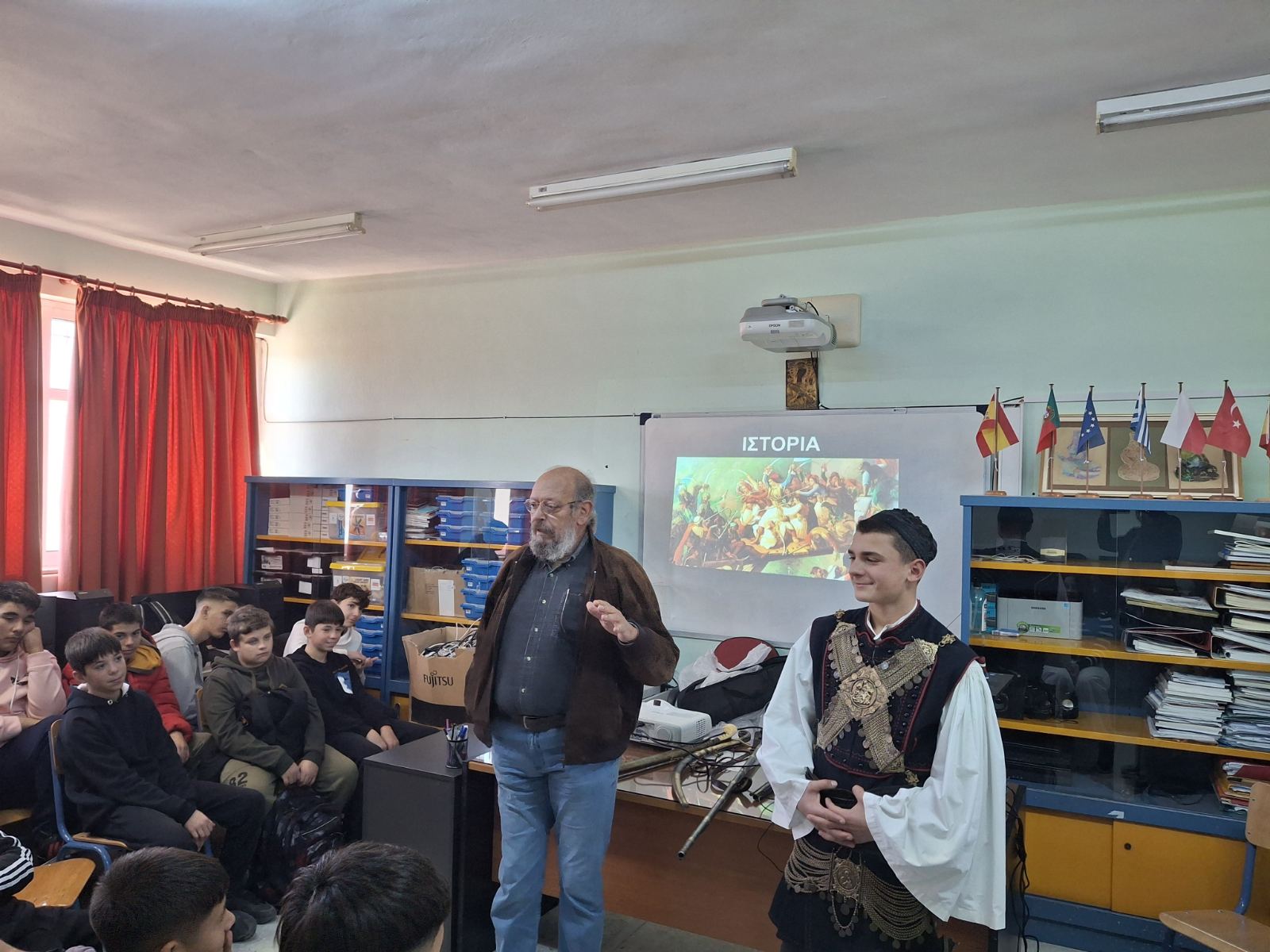 Την Τετάρτη 18 Δεκεμβρίου 2024, ο Αντιπρόεδρος του Συλλόγου Πανηγυριστών «Ο Άη Συμιός» κ. Σωκράτης Τσιτσέλης και ο Ειδικός Συνεργάτης του Συλλόγου κ. Ιωάννης Δ. Μακρής, επισκέφθηκαν το 1ο Γυμνάσιο Μεσολογγίου έπειτα από πρόσκληση της Διευθύντριας κ. Γεωργίας Παναγιωτοπούλου και του συλλόγου Διδασκόντων του σχολείου στο πλαίσιο της Δράσης με τίτλο «Μπολιάζοντας τη νέα γενιά με το έθιμο και τις τέχνες του Πανηγυριού τ’ Άη Συμιού», που υλοποιεί ο Σύλλογός μας και η οποία εντάσσεται στο πρόγραμμα «Νεότερη Πολιτιστική Κληρονομιά» του Υπουργείου Πολιτισμού.