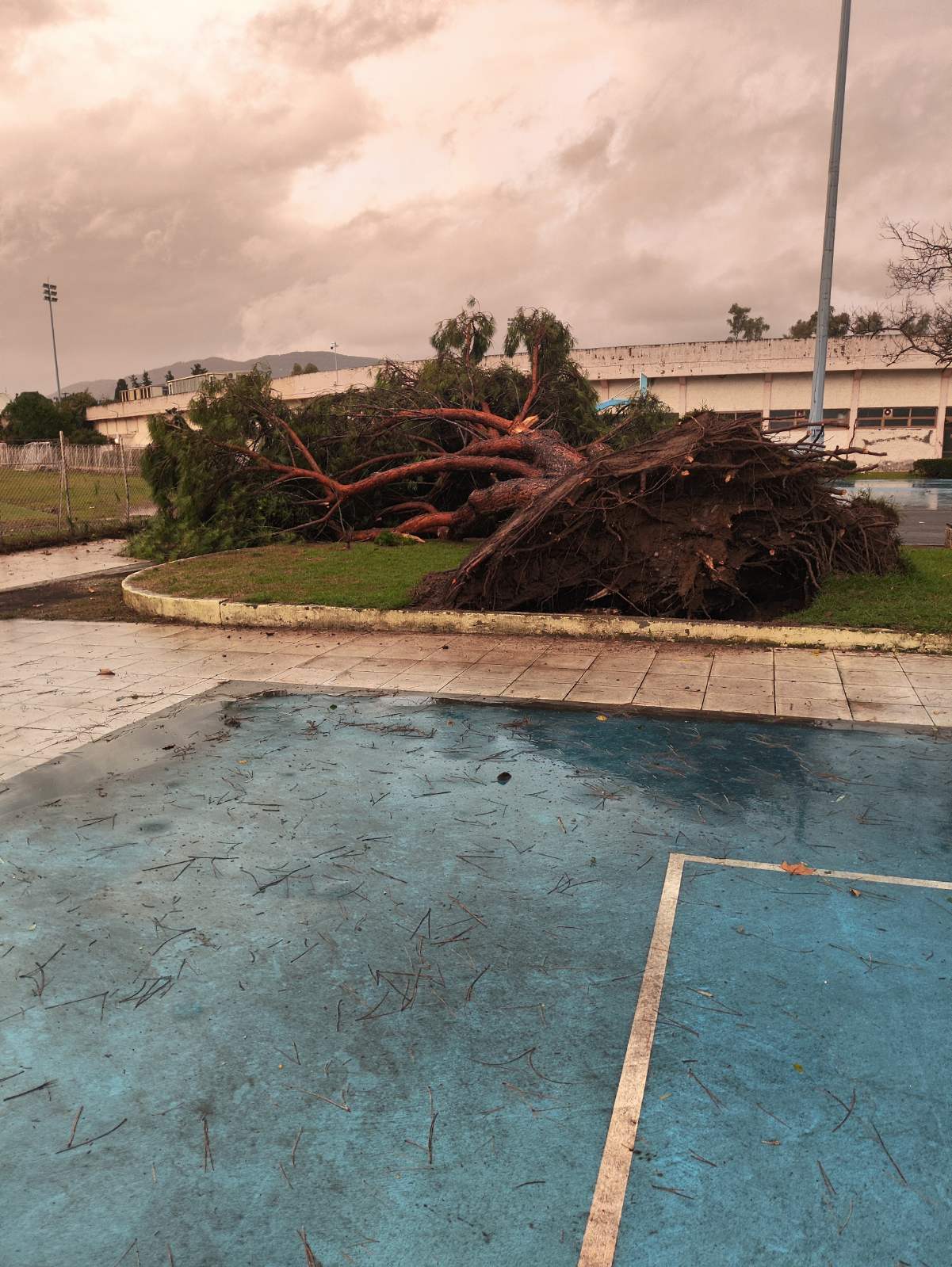 Η μανία του αέρα αποτυπώνεται στο δένδρο που ο δυνατός αέρας το «προσγείωσε» εν είδει θεατή… στην εξέδρα του κεντρικού γηπέδου του ΔΑΚ Αγρινίου. Μόνο και μόνο για παρασυρθεί ένα δένδρο τόσες δεκάδες μέτρα, αρκεί για να καταλάβει κανείς την απίστευτη δύναμή του.