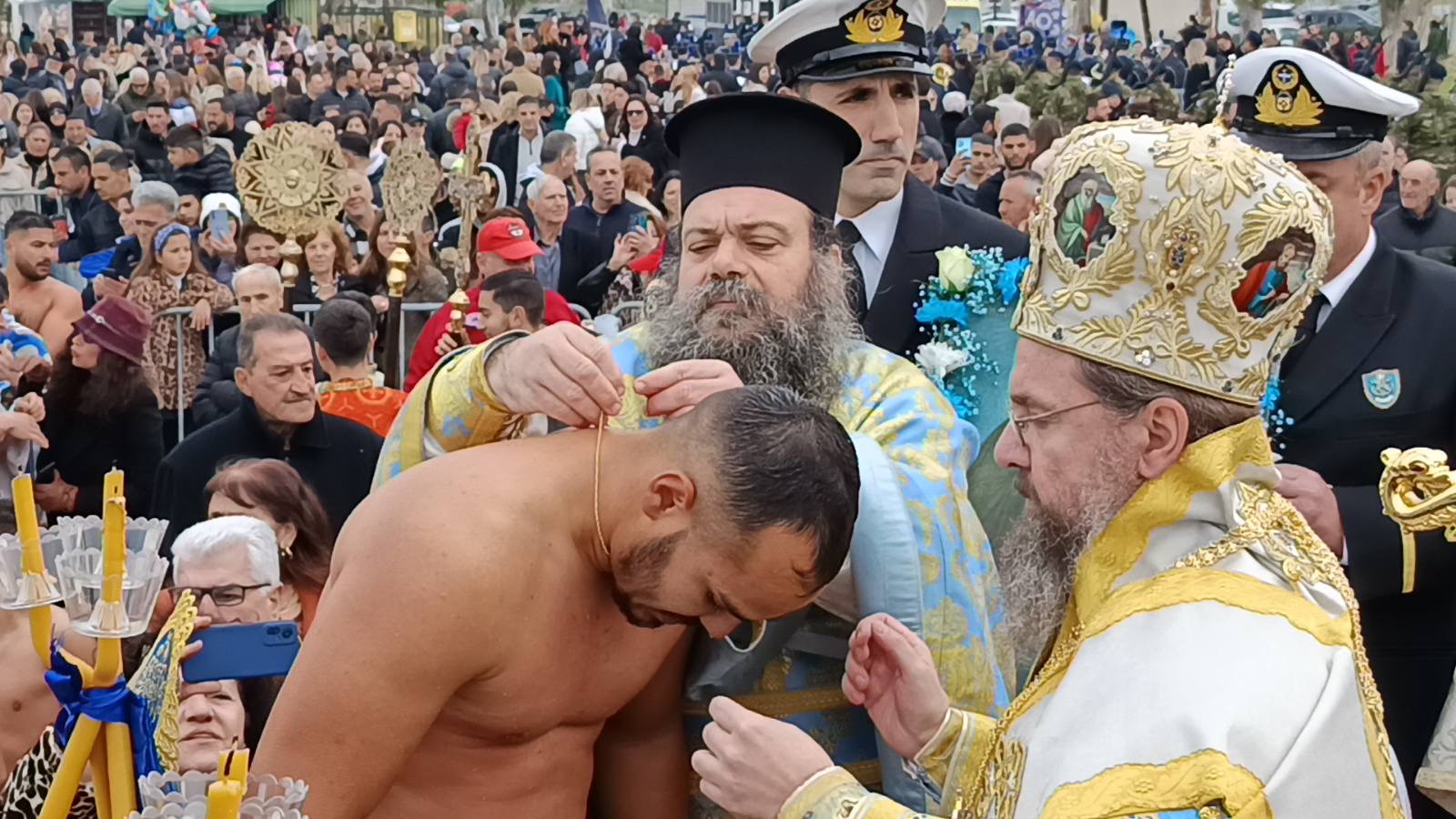Ακολουθώντας το πατροπαράδοτο έθιμο, πολλοί πιστοί προσπάθησαν να πιάσουν τον Σταυρό βουτώντας στα κρύα νερά της θάλασσας, με τον νεαρό Αναστάσιο Αριστόπουλο να το καταφέρνει και να λαμβάνει την ευλογία του Μητροπολίτη κ.κ. Δαμασκηνού.