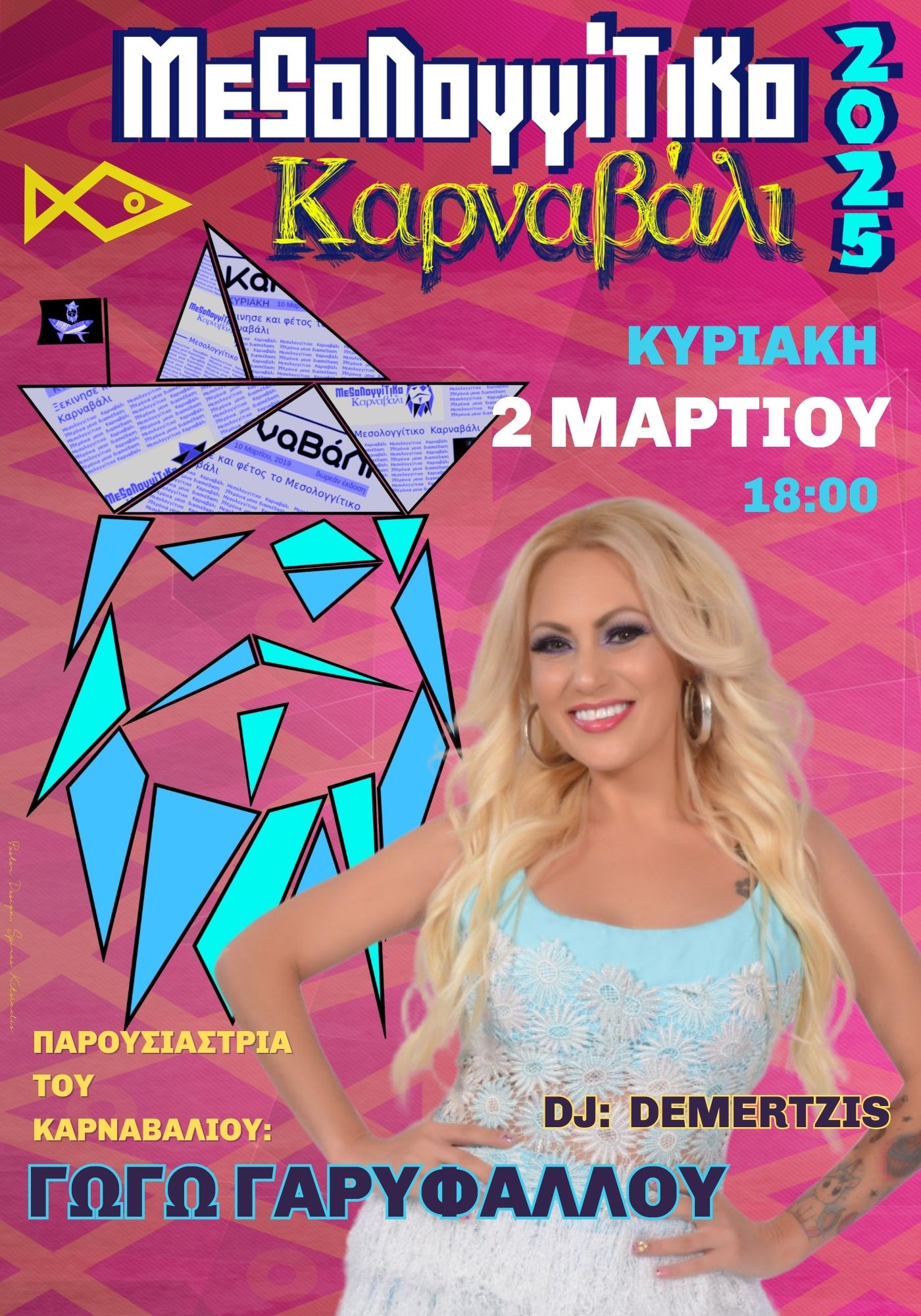 Η παρέλαση των καρναβαλιστών ξεκινά από την οδό Ελεύθερων Πολιορκημένων και καταλήγει στην Πλατεία Μάρκου Μπότσαρη, όπου θα γίνει ρίψη πυροτεχνημάτων. Μαζί μας η αγαπημένη παρουσιάστρια Γωγώ Γαρυφάλλου και ο DJ Demertzis.