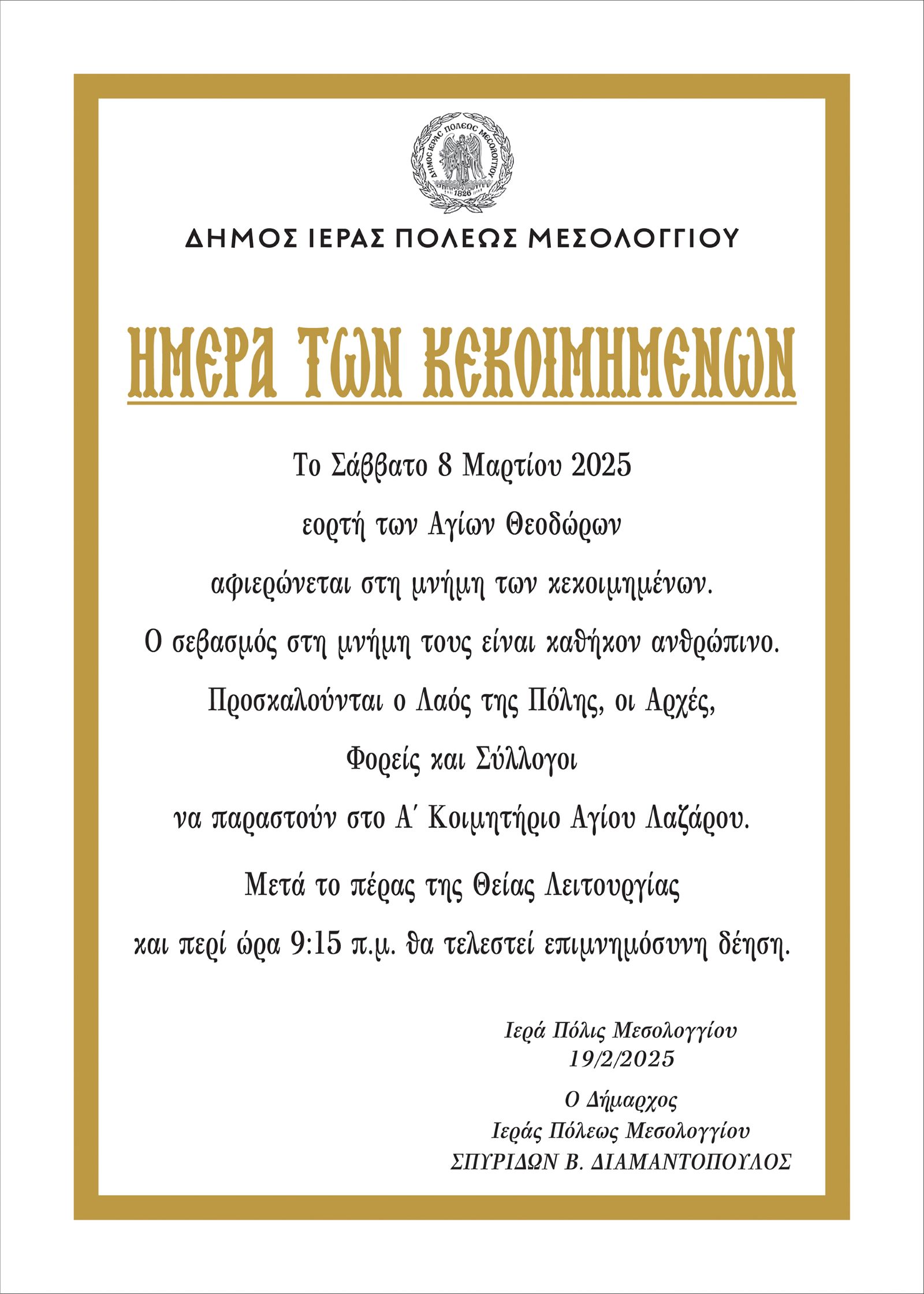 Προσκαλούνται ο Λαός της Πόλης, οι Αρχές, Φορείς και Σύλλογοι να παραστούν στο Α’ Κοιμητήριο Αγίου Λαζάρου.