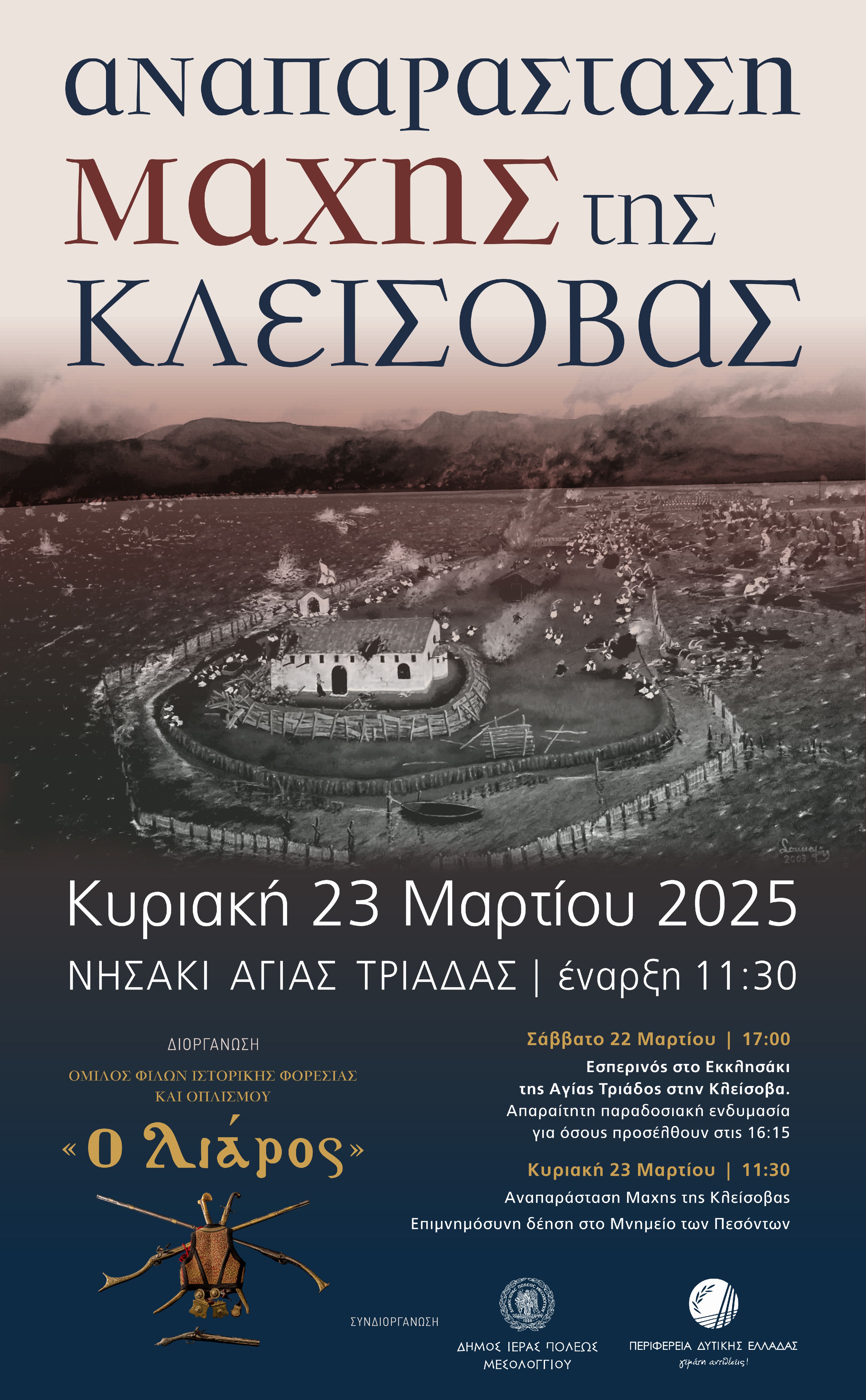 Ο Δήμος Ιεράς Πόλεως Μεσολογγίου, η Περιφέρεια Δυτικής Ελλάδας και ο Όμιλος Φίλων Ιστορικής Φορεσιάς και Οπλισμού «Ο Λιάρος» διοργανώνουν την Αναπαράσταση της Μάχης της Κλείσοβας, η οποία θα πραγματοποιηθεί στις 11:30 την Κυριακή 23 Μαρτίου 2025 στο Νησάκι της Αγίας Τριάδας.
