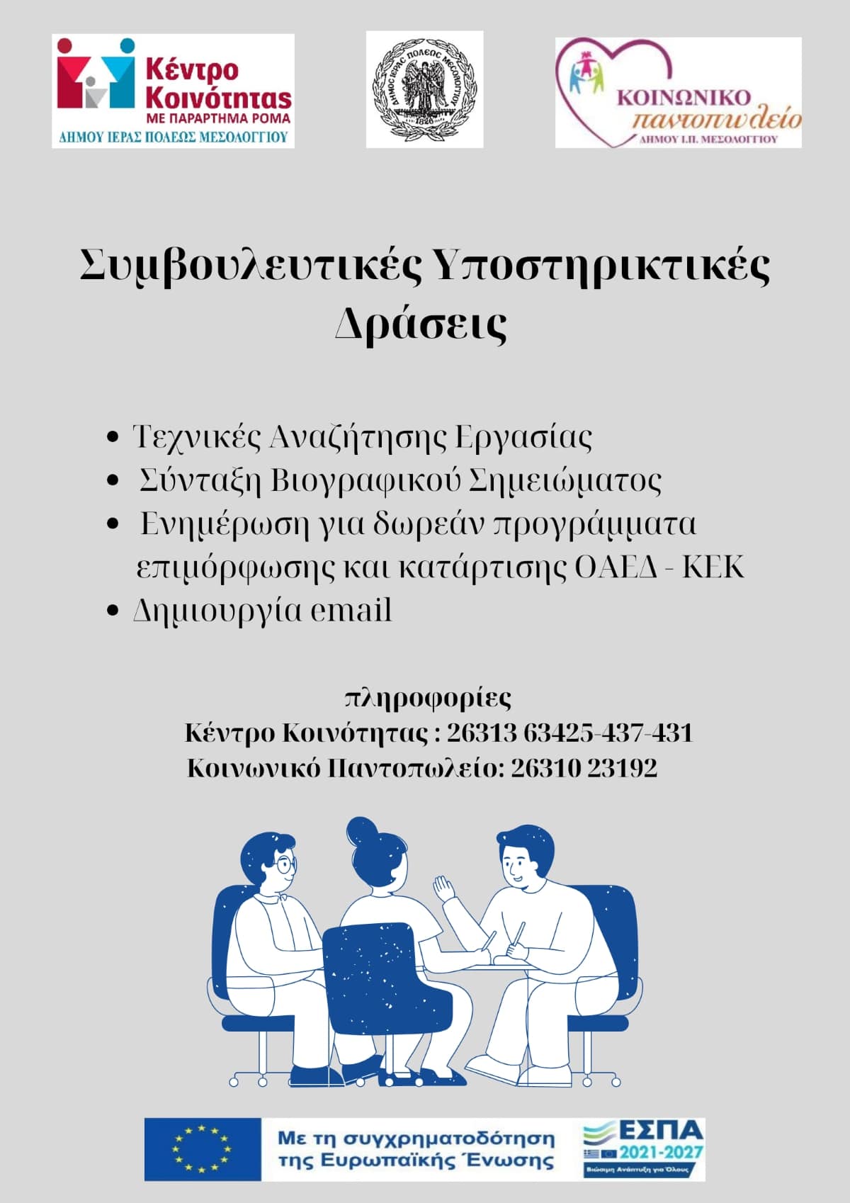Δωρεάν υπηρεσίες εργασιακής συμβουλευτικής και ενδυνάμωσης για την προώθηση της απασχόληση μεταξύ ανέργων και όσων αναζητούν εργασία, θα παρέχουν τα στελέχη των Κοινωνικών Δομών του Αυτοτελούς Τμήματος Κοινωνικής Προστασίας (Κέντρο Κοινότητας και Κοινωνικό Παντοπωλείο) του Δήμου Ιερής Πόλης Μεσολογγίου από την προσεχή Δευτέρα, 17 Μαρτίου 2025.