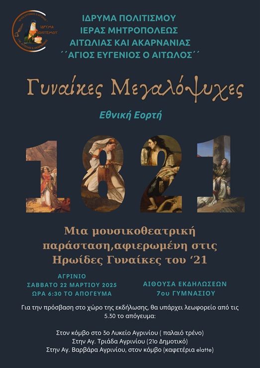 Η Ιερά Μητρόπολη Αιτωλίας και Ακαρνανίας γνωστοποιεί, ότι για την διευκόλυνση των ανθρώπων που επιθυμούν να παρακολουθήσουν την επετειακή εκδήλωση που διοργανώνει το Ίδρυμα Πολιτισμού της Ιεράς Μητροπόλεως, «Άγιος Ευγένιος ο Αιτωλός», το Σάββατο 22 Μαρτίου 2025 και ώρα 6.30’ το απόγευμα, στο Αγρίνιο, στην αίθουσα εκδηλώσεων του 7ου Γυμνασίου, θα διατεθεί λεωφορείο για την δωρεάν μετακίνηση των συμπολιτών μας από και προς τον χώρο της εκδηλώσεως.