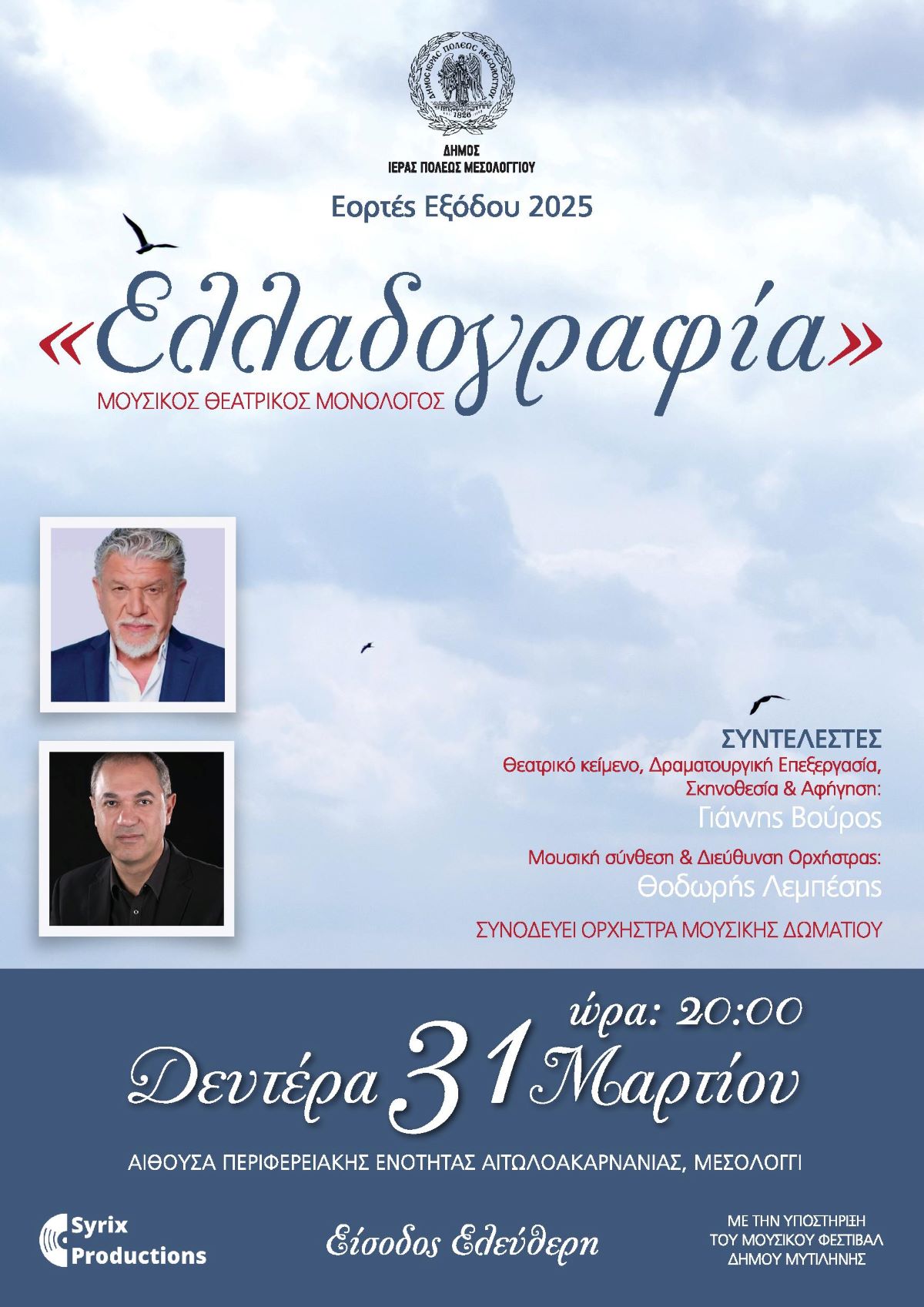 Ο Δήμος Ιερής Πόλης Μεσολογγίου, στο πλαίσιο των Εορτών Εξόδου 2025, παρουσιάζει τον μουσικό θεατρικό μονόλογο «Ελλαδογραφία», μια παράσταση που ενώνει τη θεατρική αφήγηση με τη μουσική, δημιουργώντας ένα καθηλωτικό καλλιτεχνικό γεγονός.
