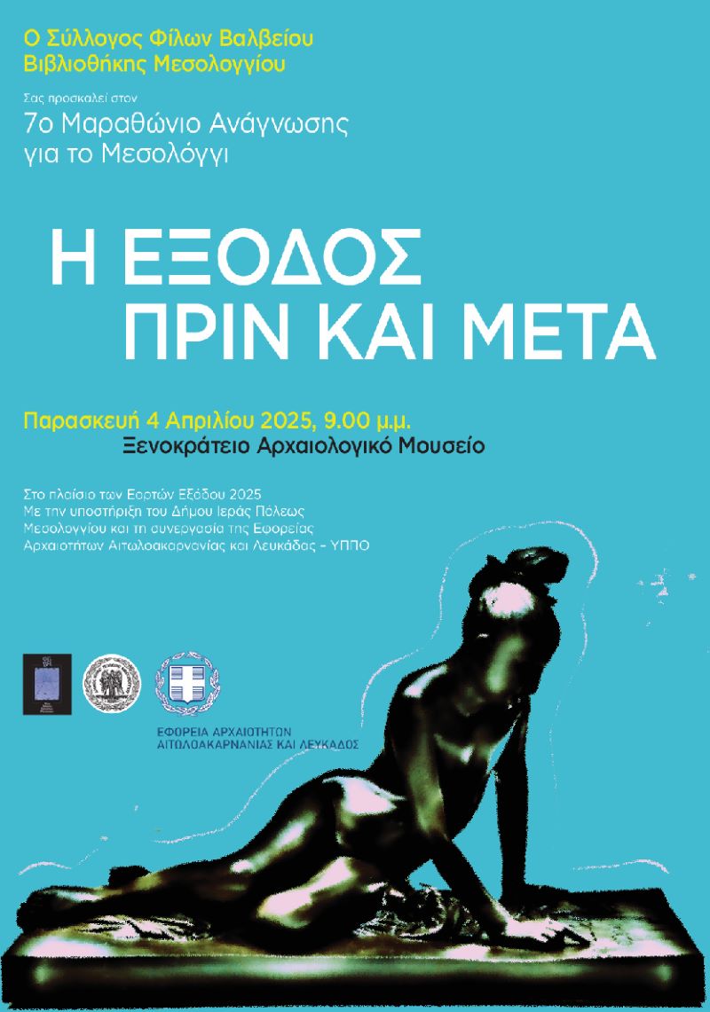 Ο Δήμος Ιερής Πόλης Μεσολογγίου και ο Σύλλογος Φίλων Βαλβείου Βιβλιοθήκης Μεσολογγίου σας προσκαλούν στον 7ο Μαραθώνιο Ανάγνωσης για το Μεσολόγγι «Η Έξοδος. Πριν και Μετά», η οποία θα πραγματοποιηθεί στο Ξενοκράτειο Αρχαιολογικό Μουσείο την Παρασκευή, 4 Απριλίου 2025, στις 21:00.