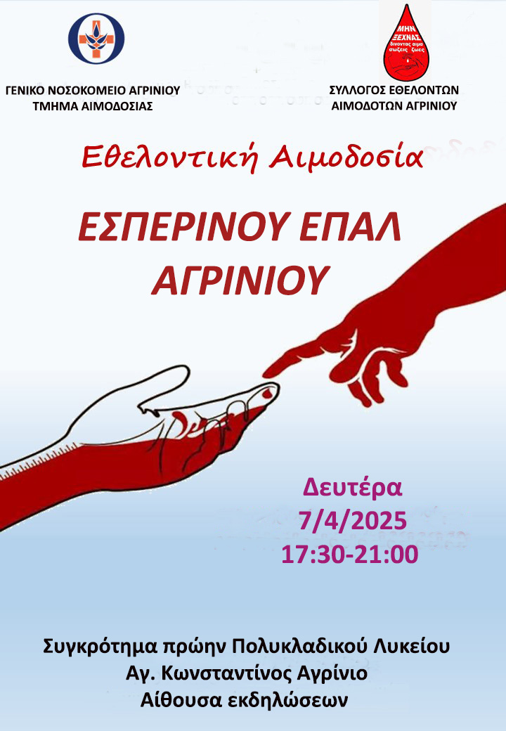 Τη Δευτέρα 7/4/2025 και ώρα 17:30-21:00 το Εσπερινό ΕΠΑ.Λ. Αγρινίου θα πραγματοποιήσει την ετήσια Εθελοντική Αιμοδοσία στο χώρο του σχολείου σε συνεργασία με το τμήμα Αιμοδοσίας του Γενικού Νοσοκομείου Αγρινίου και τον Σύλλογο Εθελοντών Αιμοδοτών Αγρινίου.