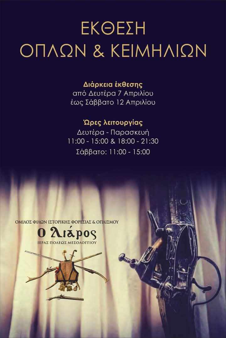 Η Έκθεση όπλων και κειμηλίων από τον Όμιλο Φίλων Ιστορικής Φορεσιάς και Οπλισμού "Ο Λιάρος", θα διαρκέσει έως το Σάββατο 12 Απριλίου.