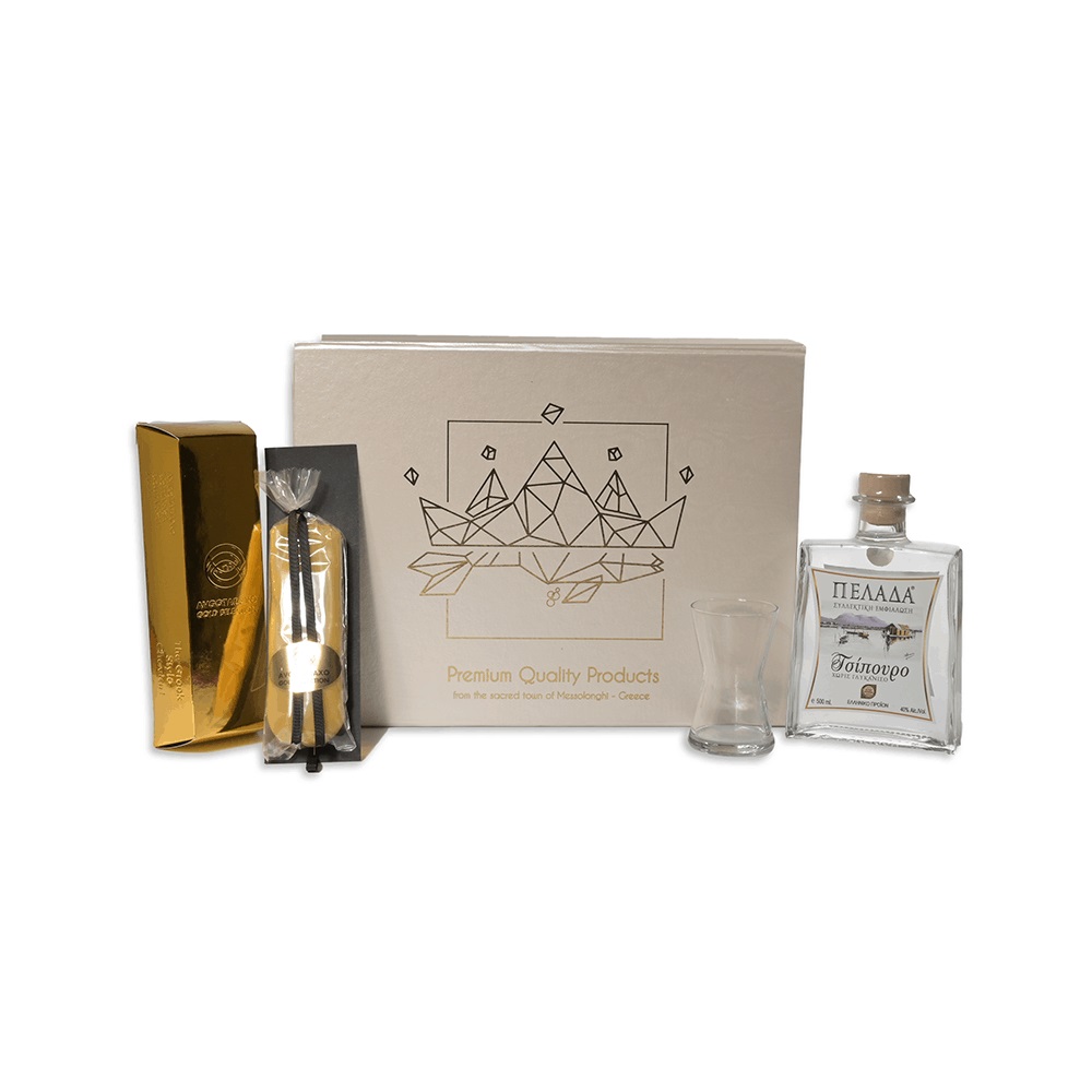 - το λευκό κουτί δώρου (white gift box) της εταιρίας Πασιόπουλος με ένα συλλεκτικό τσίπουρο Πελάδα, δύο ποτήρια και ένα «Αυγοτάραχο Gold Selection» με το χάλκινο βραβείο για» τη συσκευασίας του .