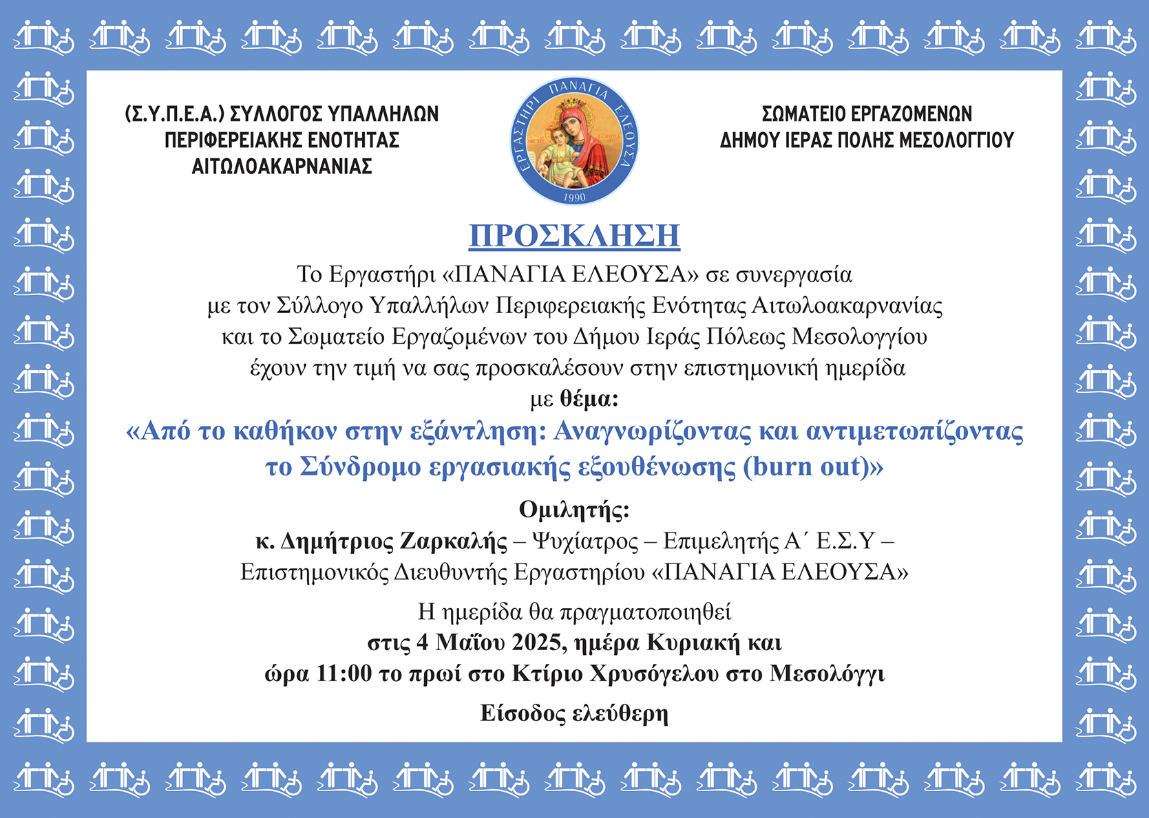 Το Εργαστήρι «ΠΑΝΑΓΙΑ ΕΛΕΟΥΣΑ», σε συνεργασία με τον Σύλλογο Υπαλλήλων Περιφερειακής Ενότητας Αιτωλοακαρνανίας και το Σωματείο Εργαζομένων του Δήμου Ιεράς Πόλεως Μεσολογγίου, διοργανώνουν επιστημονική ημερίδα με τίτλο: