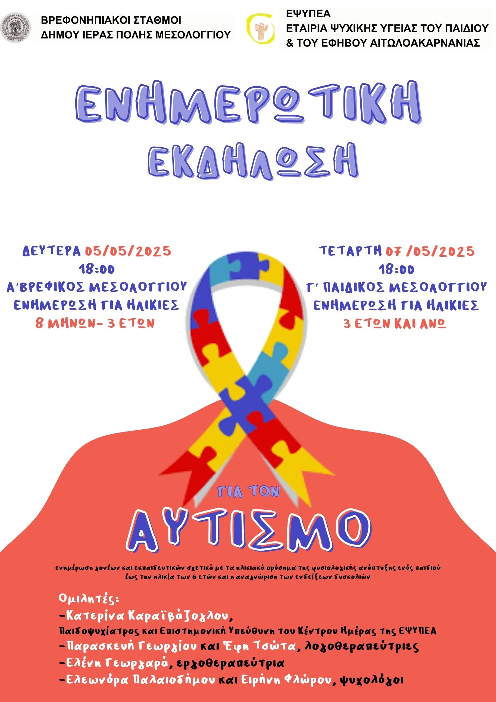 Οι Βρεφονηπιακοί Σταθμοί του Δήμου Ιεράς Πόλεως Μεσολογγίου, σε συνεργασία με την Εταιρία Ψυχικής Υγείας Παιδιού και Εφήβου Αιτωλοακαρνανίας (ΕΨΥΠΕΑ), σας προσκαλούν στις ενημερωτικές εκδηλώσεις που διοργανώνουν με θέμα τον Αυτισμό: