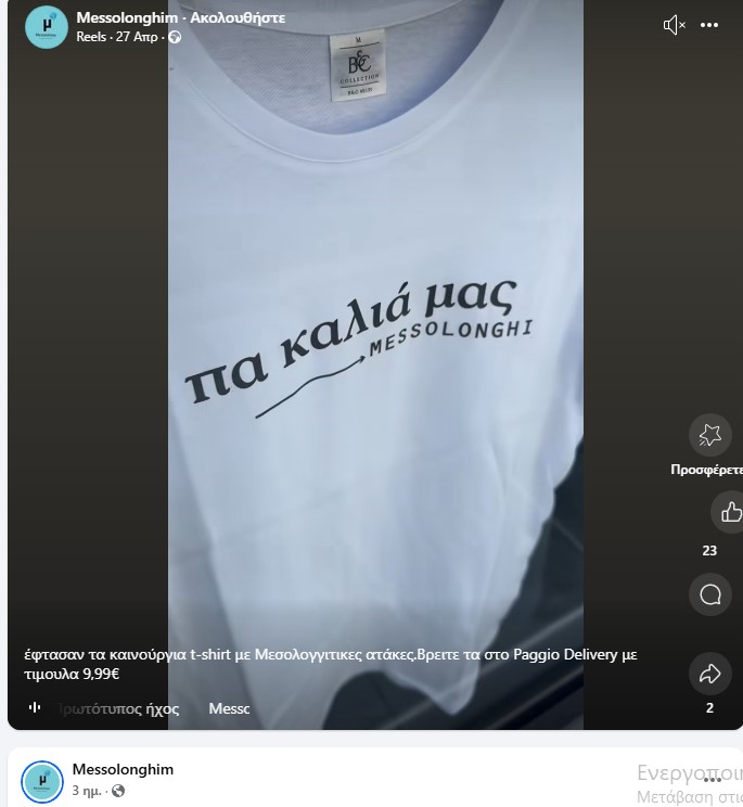 Η... αντιδιαφήμιση λέει "έφτασαν τα καινούργια t-shirt με Μεσολογγίτικες ατάκες, βρείτε τα στο Paggio Delivery με τιμούλα 9,99€" αλλά και "...μην πάτε και το αγοράσετε στα παιδιά σας, είναι ο Διάβολος", σε μια επίδειξη αυτοσαρκασμού.