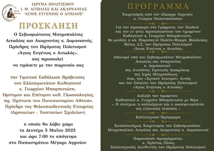 Στο πλαίσιο αυτό θα πραγματοποιηθεί Τιμητική Εκδήλωση Βραβεύσεως από τον Σεβασμιώτατο Μητροπολίτη Αιτωλίας και Ακαρνανίας κ. Δαμασκηνό και το Ίδρυμα Πολιτισμού της Ιεράς Μητροπόλεως «Άγιος Ευγένιος ο Αιτωλός» του Ελλογιμωτάτου Καθηγητού κ. Γεωργίου Μπαμπινιώτη, ο οποίος κατάγεται από την Μπαμπίνη Αιτωλοακαρνανίας, Ομοτίμου και Επιτίμου Καθηγητού Γλωσσολογίας, πρ. Πρυτάνεως του Εθνικού και Καποδιστριακού Πανεπιστημίου Αθηνών, Προέδρου της Φιλεκπαιδευτικής Εταιρείας (Αρσακείων – Τοσιτσείων Σχολείων), την Δευτέρα 5 Μαΐου 2025 και ώρα 7:00’ το απόγευμα, στο Παπαστράτειο Μέγαρο Αγρινίου.
