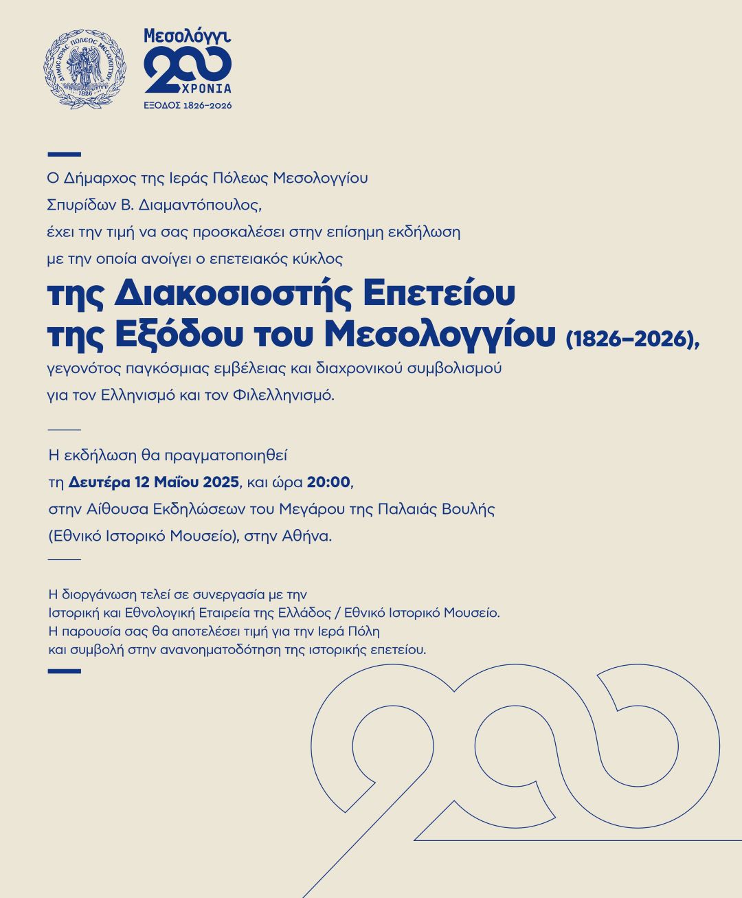 Ο Επετειακός Κύκλος της Διακοσιοστής Επετείου της Εξόδου του Μεσολογγίου, ανοίγει σήμερα Δευτέρα, 12 Μαΐου 2025 στις 20:00, με εκδήλωση που θα πραγματοποιηθεί στην Αίθουσα Εκδηλώσεων του Μεγάρου της Παλιάς Βουλής (Εθνικό Ιστορικό Μουσείο) στην Αθήνα (Πλατεία Κολοκοτρώνη, Σταδίου 13).
